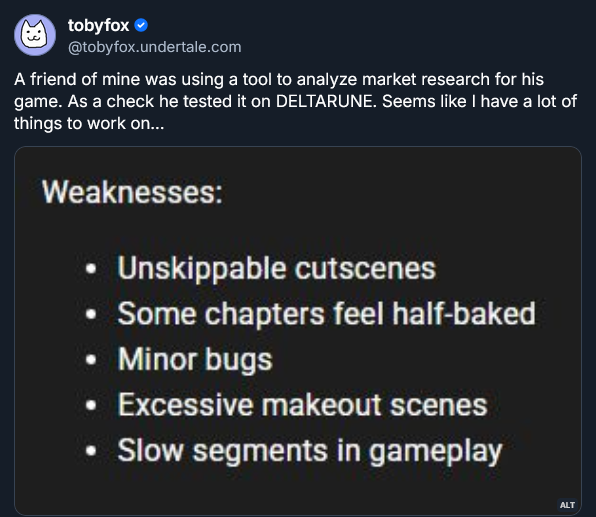 I might be too woke but it's kinda weird seeing Toby normalize AI like that without acknowledging it (I don't have concrete proof but I'm like 99% sure this "market research tool" is just a ChatGPT prompt).It would be fine if he explicitly said "my friend used AI for market research and this is what it said about my game, let's laugh at this nonsense together". Maybe he just doesn't recognize this as AI, and I can't fault him for that.