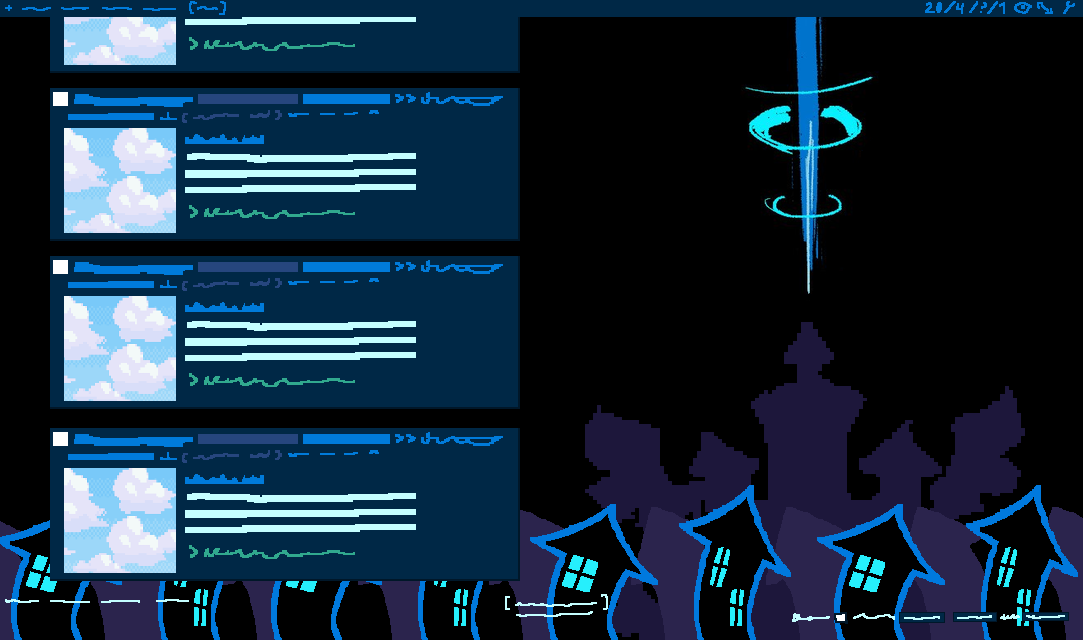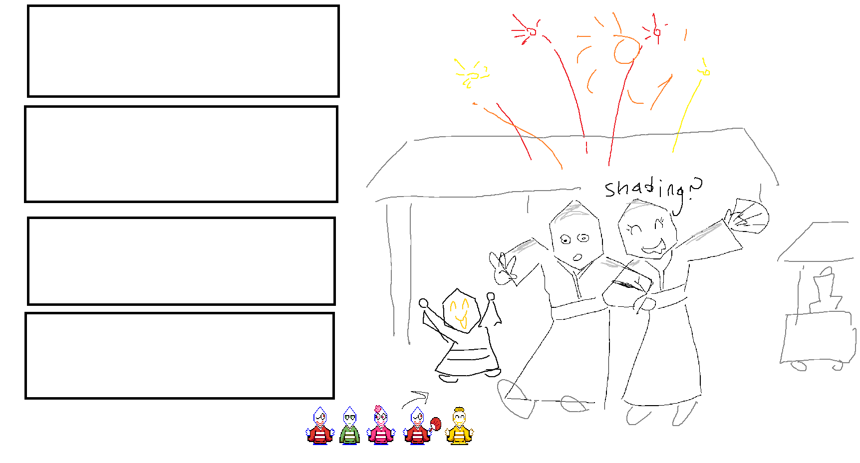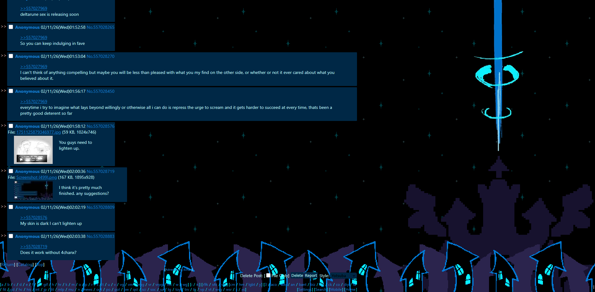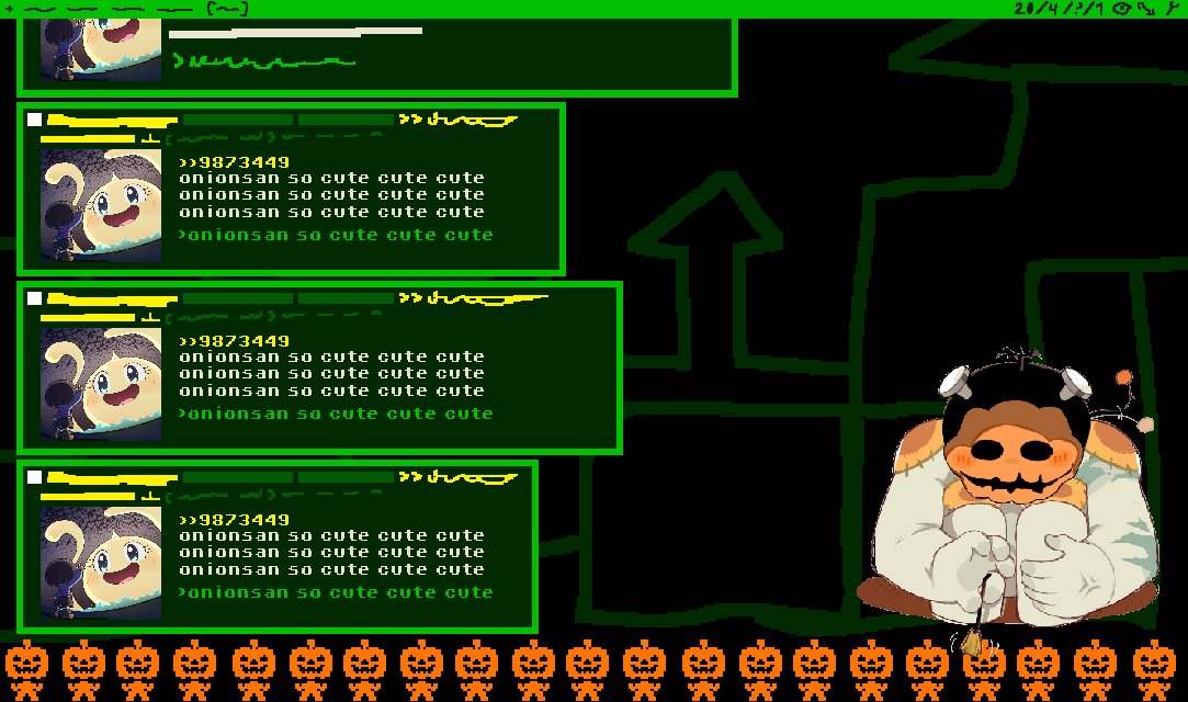 im not sure what my next theme should be. probably the tv/parental lock area an anon suggestedi also had an idea for some kind of japanese festival theme with battat and fujo in kimonos based off sprites i did awhile ago, and there would be fireworks in the background. that might be too much of an undertaking for me though since I would have to draw the whole thingmaybe i should make a catti or susie theme next, or maybe a tenna one