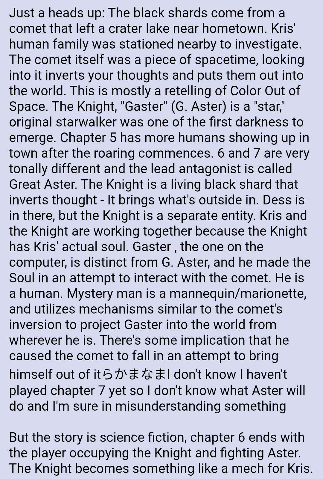 >>556978135that's true, toby really screwed the pooch on the nose nuzzle thing.>>556978207>What is your theory here? Continuei don't think it really deserves to be called a theory. i had a sleep deprived induced idea a while back that when tenna says>... I WISH THEY NEVER BROUGHT THAT LAPTOP HOME...he isn't actually referring to kris bringing queen home to play, but that he and queen both had a previous owner before being given away, and the knight is deliberately making dark worlds where its former possessions were.there is severe personal bias there though. i've always thought the part of chapter 3 with ramb saying that kris and the girl invented all the dark worlds felt, fahaha, forced