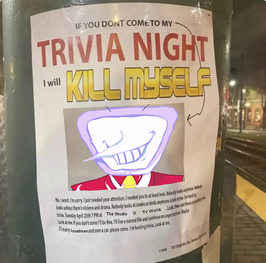 >>557048752Tenna wakes up all the Pippins in the middle of the night for an emergency broadcast about a bird with testicles that he saw online and thought wasn't a deepfake
