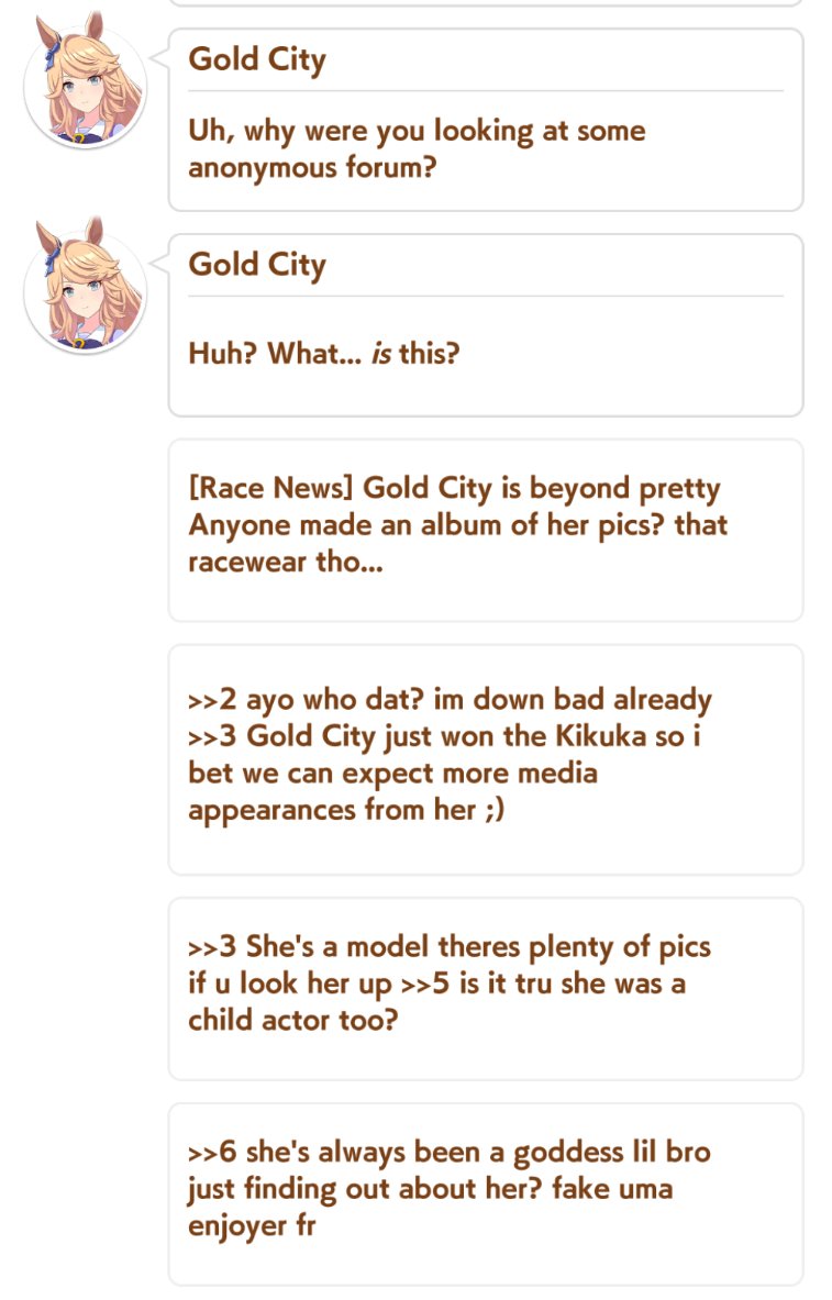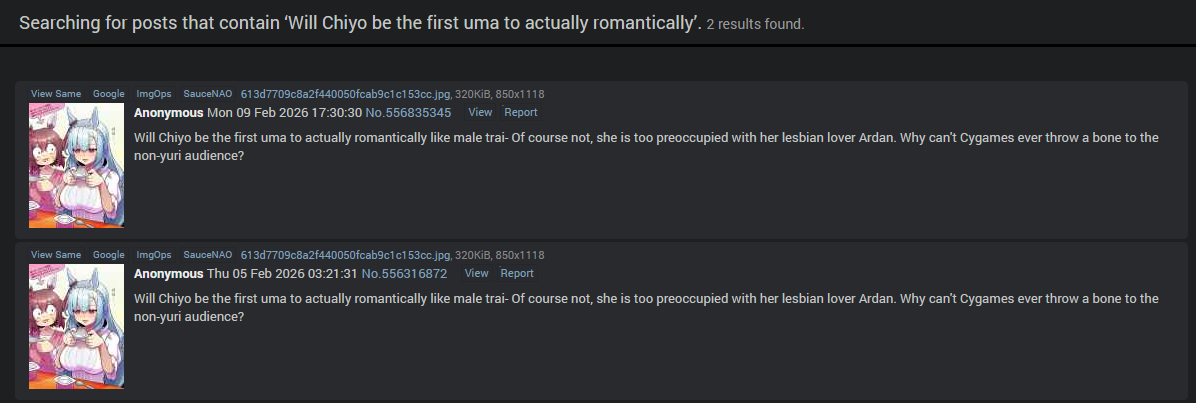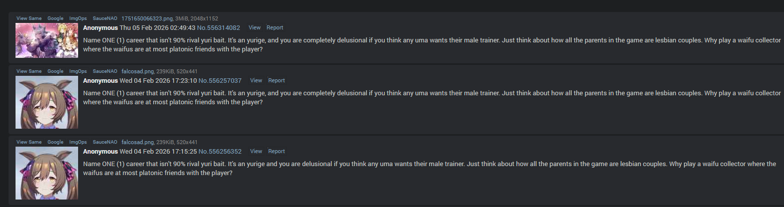 On the scale of yuribaiting I would rate Uma somewhere in the lower-middle scale since stronger yuribait+canon yuri exists in Granblue Fantasy (AND playable male characters which means yaoibait exists too). Considering how much of a mess /gbfg/ is I would consider /uma/ to be in a healthy state of mind.
