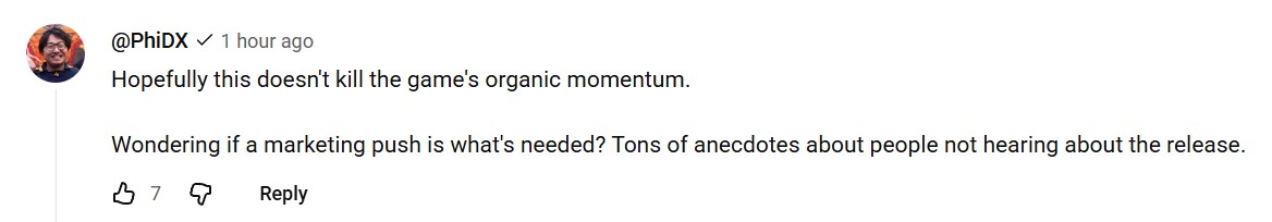 I looked at the comments in Sajam's latest videos and found PhidX. I vaguely remember both Sajam and PhidX clowning on COTW, saying shit like>I'm not even gonna check out your game since you COTW fans are annoying as fuck saying it's the savior of the FGC, return of old school games, return of real neutral and other shit like thatI remember them making fun of a literal who making a tweet defending the game, saying annoying fans like that dude with no followers are part of the reason the game failed. It's incredible that they don't see how they did the same shit with 2XKO but worse, since I'm hearing that shit is gonna save fighting games for a decade now and from actual high profile people in the FGC. Like, they're way more in denial than COTW fans, except they think their shit doesn't stink for some reason.