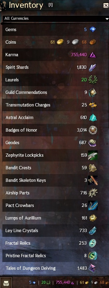 >come back from years off>dunno what most of my currencies doDo any of these convert well to gold or anything else valuable?I have a Gift of Twilight, a Gift of Mastery, and 131 Mystic Clovers in my bags, but other than that, I have no clue what I was working on when I stopped playing. I think I still had to farm Dusk and a bunch of ectos and T6(?) materials for Gifts of Might and Magic? It kinda seems like they added a crafting track for making legendaries, but I feel like you just chucked shit in the Mystic Forge back in the day?