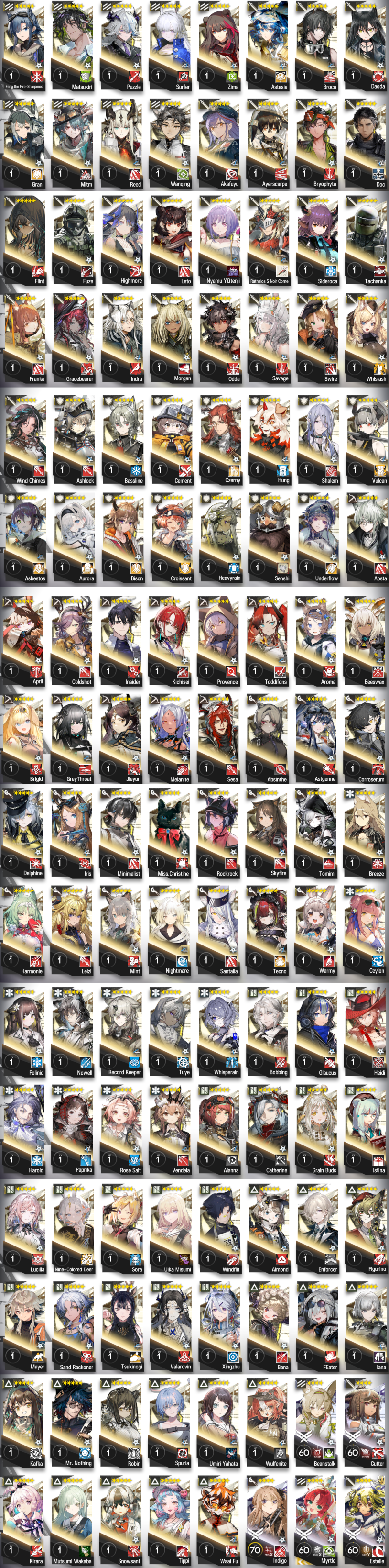 >>557022890Gravel, Ling, Amiya, Platinum, Silverash, pinecone, robin, skadi, Muelsyse, Savage, Angilena, Sussuro, Phantom, Mostima, Executor, Arturia, Reed, Necrass, Eyja, Manticore, Blue poison, Ptilosis, Whislash, Shirayuki, Perfumer, Utage, Indigo, Adnachel, THRM-EX , Castle-3,and Lancet for the non-debated