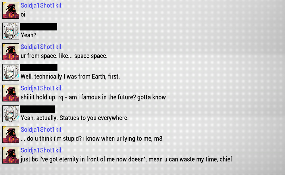 >the one black guy in Hex>literally incapable of understanding a sarcastic joke response to an absurd question>gets offended because he can't parse the obvious "of course not" implication due to narcissistic superiority complexWhat did DE mean by this?