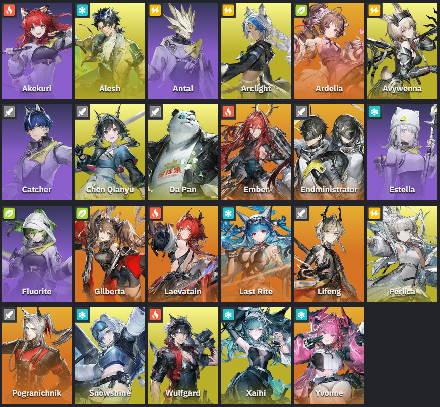 Previous thread: >>557021367>Official Websitehttps://endfield.gryphline.com/en-us>Official EN X (News)https://x.com/AKEndfield>DEV Comm (Developer Updates)https://endfield.gryphline.com/en-us/news/3846>Gilberta PV'shttps://www.youtube.com/watch?v=8hZVxeiSmQ4 - EP [Snap Shot]https://www.youtube.com/watch?v=BQom1V9TdbM - Operator Storyhttps://www.youtube.com/watch?v=h70w5ZmXLkE - Combat Demo>Chartered Headhunting ScheduleFebruary 7th to February 24th --- "The Floaty Messenger", (Gilberta)February 24th to March 13th --- "Hues of Passion", (Yvonne)TBA>Reward CodesENDFIELDGIFTENDFIELD4PC>Twitch Dropshttps://endfield.gryphline.com/special/third-party-binding?channel=twitch>Voyage to the Stars (Ongoing until March 4th)https://endfield.gryphline.com/activity/voyage-to-the-stars/en-us/>Wikishttps://wiki.skport.com/endfield (Official)https://perlica.moehttps://warfarin.wiki/enhttps://endfield.wiki.gg/>Blueprint Guideshttps://talospioneers.com/en>Stickershttps://drive.google.com/drive/folders/13KH3L6QPIKkVH7pBddv4uxwmwJsnOtklhttps://drive.google.com/drive/folders/1OuVtjv1k-9c3M6n7d4PX3CGG5bkwH04ahttps://drive.google.com/drive/folders/1AStB8bzFk3lSwMwczWPkFYCBrZe0vHOghttps://drive.google.com/drive/folders/1yS0lqUhxf8tBRtpDFfCU1y16IS2sSeF7>Fr/end/sSubmit your info, /end/min:https://forms.gle/Fo7BhZMKaKqiWyL19View other /end/mins:https://docs.google.com/spreadsheets/d/1YtxiDss0hgEQhLlZgpfzyGrJrzUcqDzOS9T6IH-BiVc/edit?usp=sharing