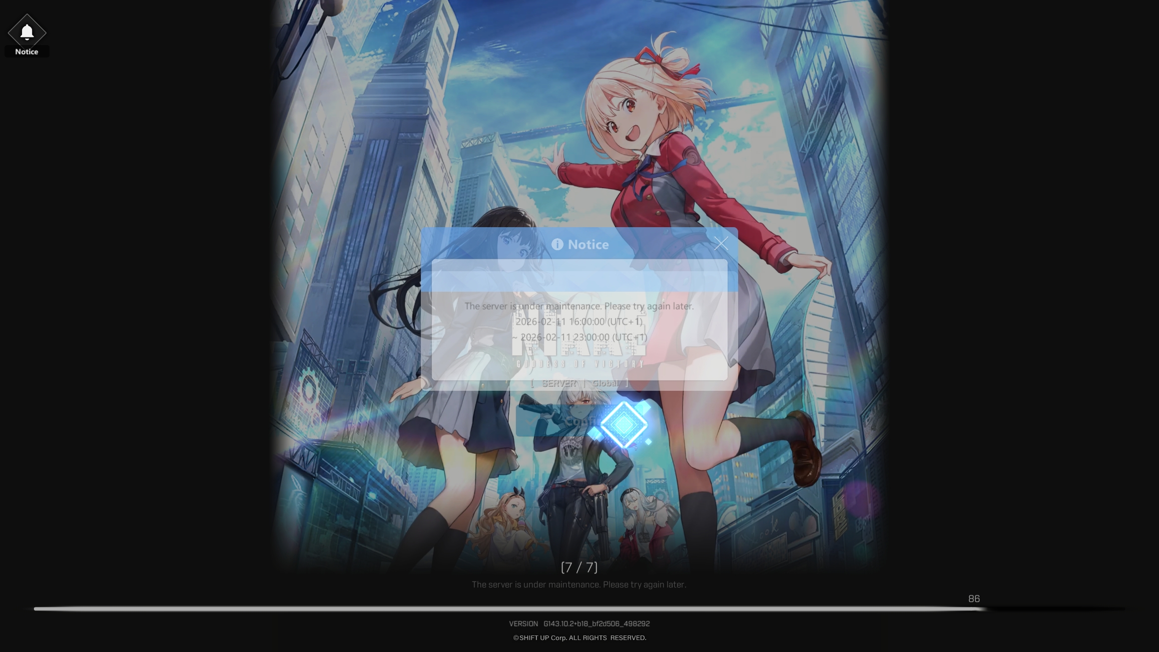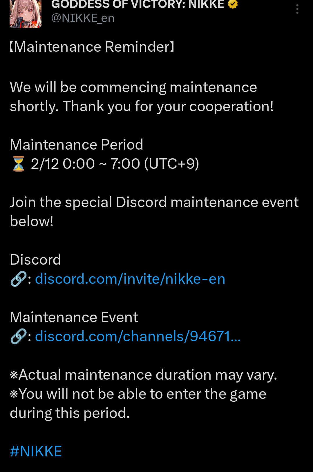 Maintenance in 2 doros and 24 pinnes>Game Download - Android/iOS/PChttps://nikke-en.com/index.html>General Info/FAQ for New Playershttps://rentry.org/NikkeInfo>Additional Linkshttps://rentry.org/nikghomeALL DATES/TIMES LISTED BELOW ARE UTC+9 (KOREA TIME)>Update on February 12https://nikke-en.com/newsdetail.html?col_name=&sid=&content_id=4fb0d316a02f2a4c62a89cfaddc22ca30853>Developer's Note: January 2025https://nikke-en.com/newsdetail.html?content_id=4e97e053a5501a40a3ab73ca13978b6f65da>Current EventsFATAL MAID - January 29 ~ February 11>Upcoming EventsLycoris Recoil Collab - February 12 ~ March 12>Current Special RecruitsVelvet - January 29 ~ February 11>Upcoming Special RecruitsChisato Nishikigi - February 12 ~ March 12Takina Inoue - February 19 ~ March 12>Current Costume PassesVelvet: Sensual Rabbit [Mission Pass] - February 1 ~ February 28>Upcoming Costume PassesChisato Nishikigi: Red Spark Guitar [Mission Pass] - February 12 ~ March 12Takina Inoue: Blue Pulse Bass [Mission Pass] - February 19 ~ March 12Mast Romantic Maid: Tea Service [Costume Gacha] - February 12 ~ March 12>Codes-Previous: >>557020826