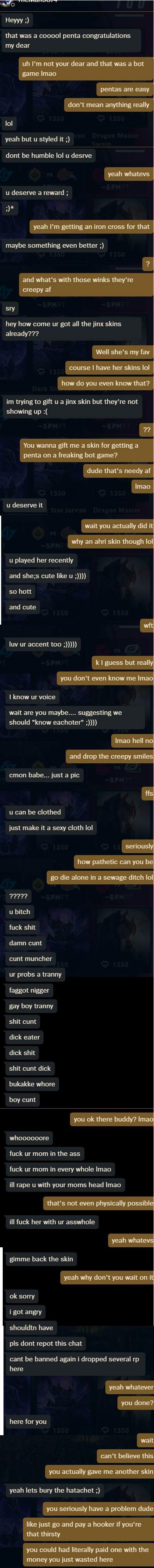 >>557055184im so sick of the chink skins fr there's like fucking 20 different skinlines that are all chinese and some champs have skins in all of them like bro we gotta nuke tencent.