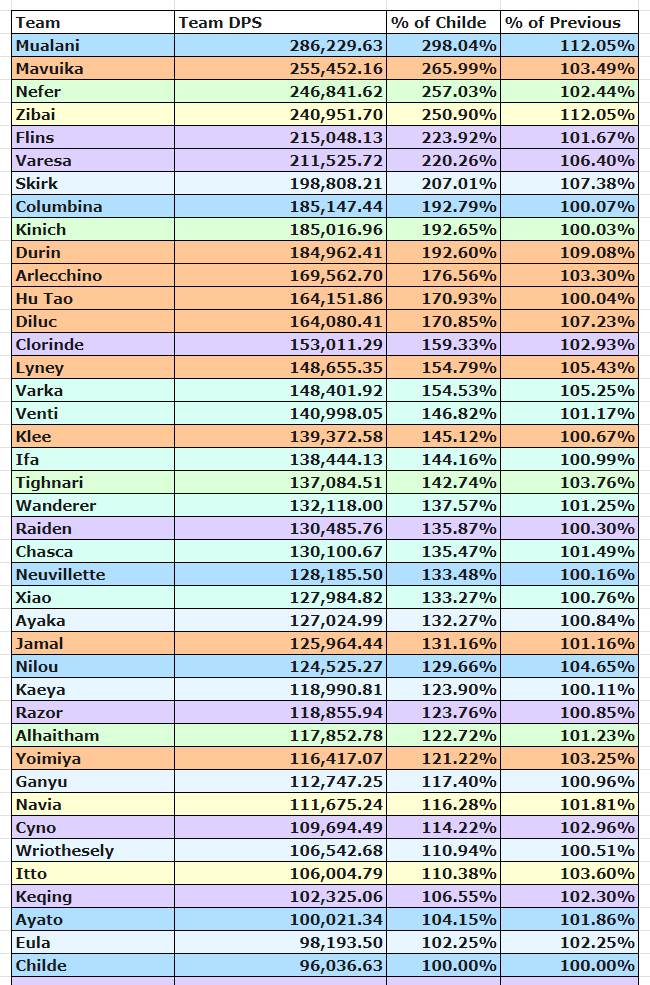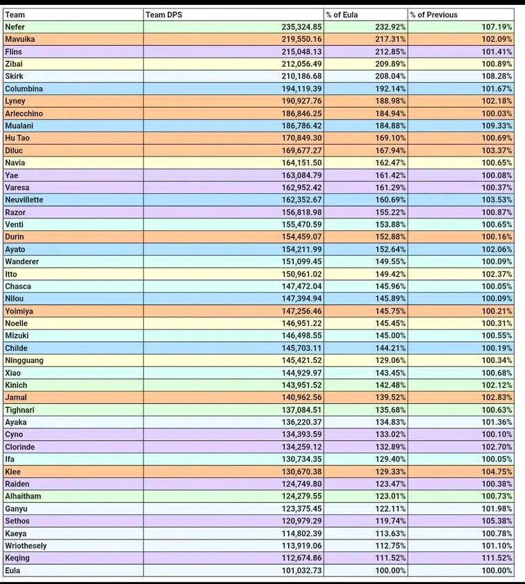 >>557073984it's not strictly non-wheel chair, but the previous chart was made with ineffa+bina on 99% of the teams so this one is much better>Teams are at 4 Cost (Limited 5 stars are 1 cost, Standard 5 stars 0 cost up to C2)>4 Stars are 0 cost, but must be calced at C2 unless reasonable to assume otherwise (ex: shop characters are C6. 4 stars tied to 5 star banner can be C6 if corresponding 5 star is C2+)>On-Fielder must be at least close to 40% of teams DMG for team to be used for them (with some exceptions).>40 total subs (1 fixed into each stat, 30 liquid. 3 liquid allowed per viable substat. Ex: ATK/DMG/Crit Rate build can use 12 CR subs 15 CDMG 3 ATK%)>5 stars available with the quarterly free Constellation are calculated at C1, unless their C1 is utterly useless (ex: Ayaka, Yoimiya)