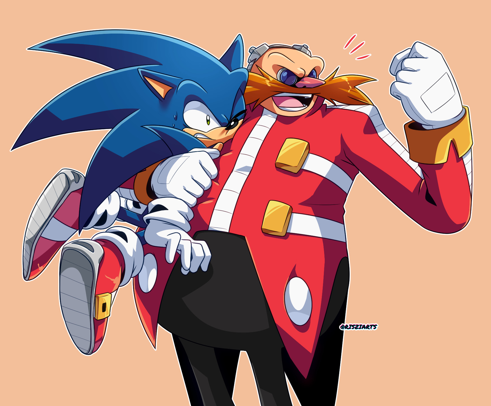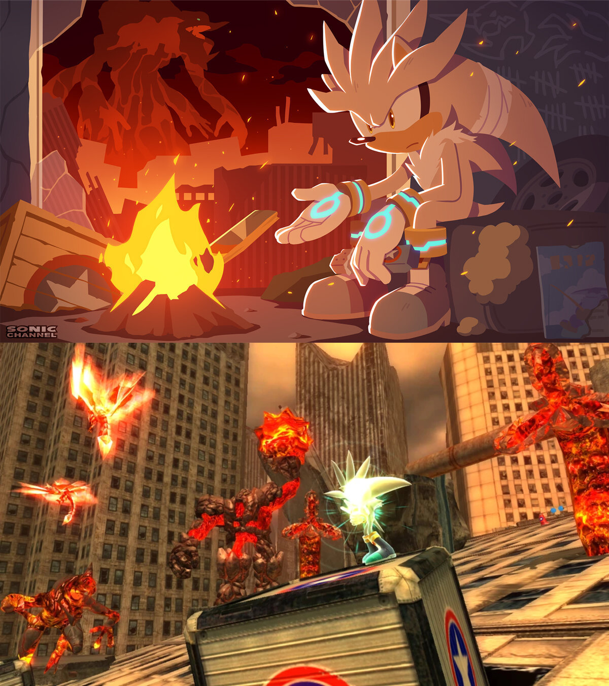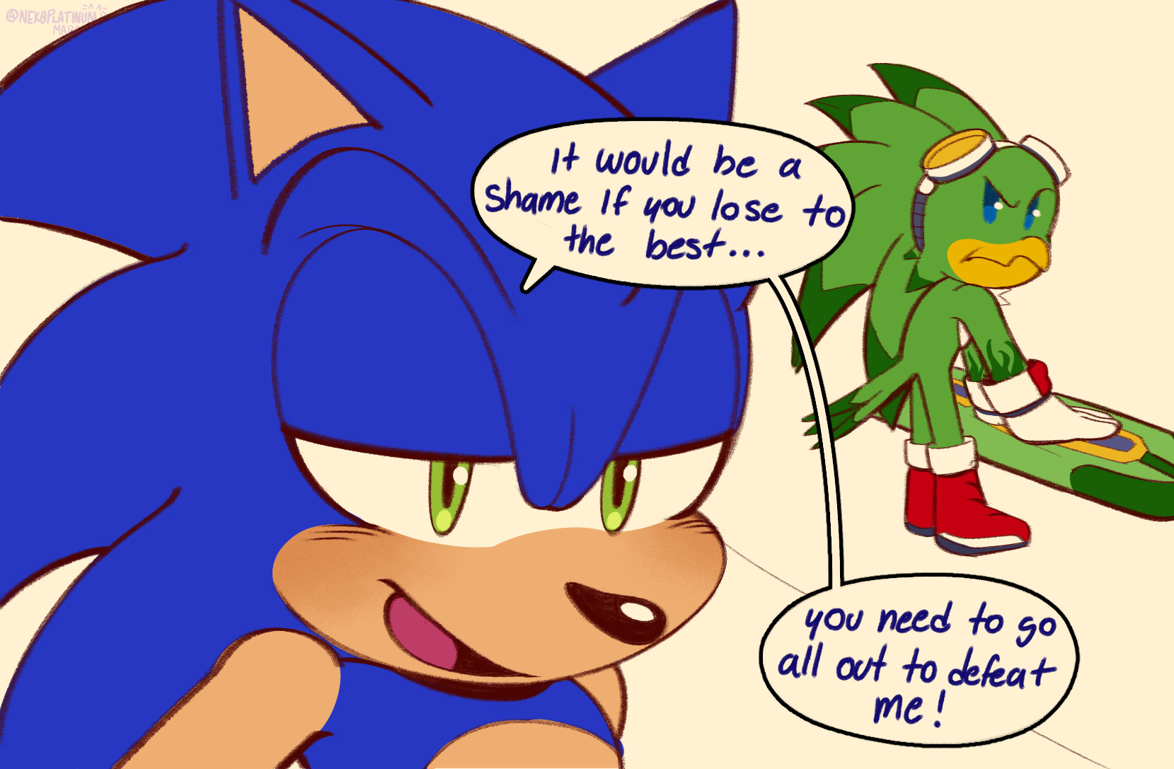 >>557075597>Sonic: Your lust for power's totally gone to your head. You've hurt too many people and you gotta be stopped. [smirking] So I'll do just that.>Sonic summons the Emeralds>Infinite: [sneering] You WILL tryhttps://youtu.be/Ki_Nn95hj48?si=FEoIUS73i-VQpbXH&t=194>Sonic turns Super and the 2 lunge at each other, creating a huge shockwave of power>It's Super Sonic vs Infinite. A badass Dragon Ball Z type fight.