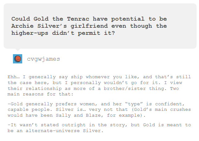 >>557088771In retrospect, Reboot-Archie was like a weird bridge between Preboot-Archie and IDW.>Reboot wasn't even a real reboot, it was more like a continuation with all the legally-questionable parts sanded off disguised as retcons, and only lasted one major arc (Unleashed)>Many of the creative team jumped from Archie to IDW and implemented ideas that would've been used had Sega renewed the Archie license
