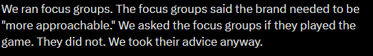 >>557114942>The problem is that old players are starting to find us unrecognizable.>And we don't have a focus group for that.It's over