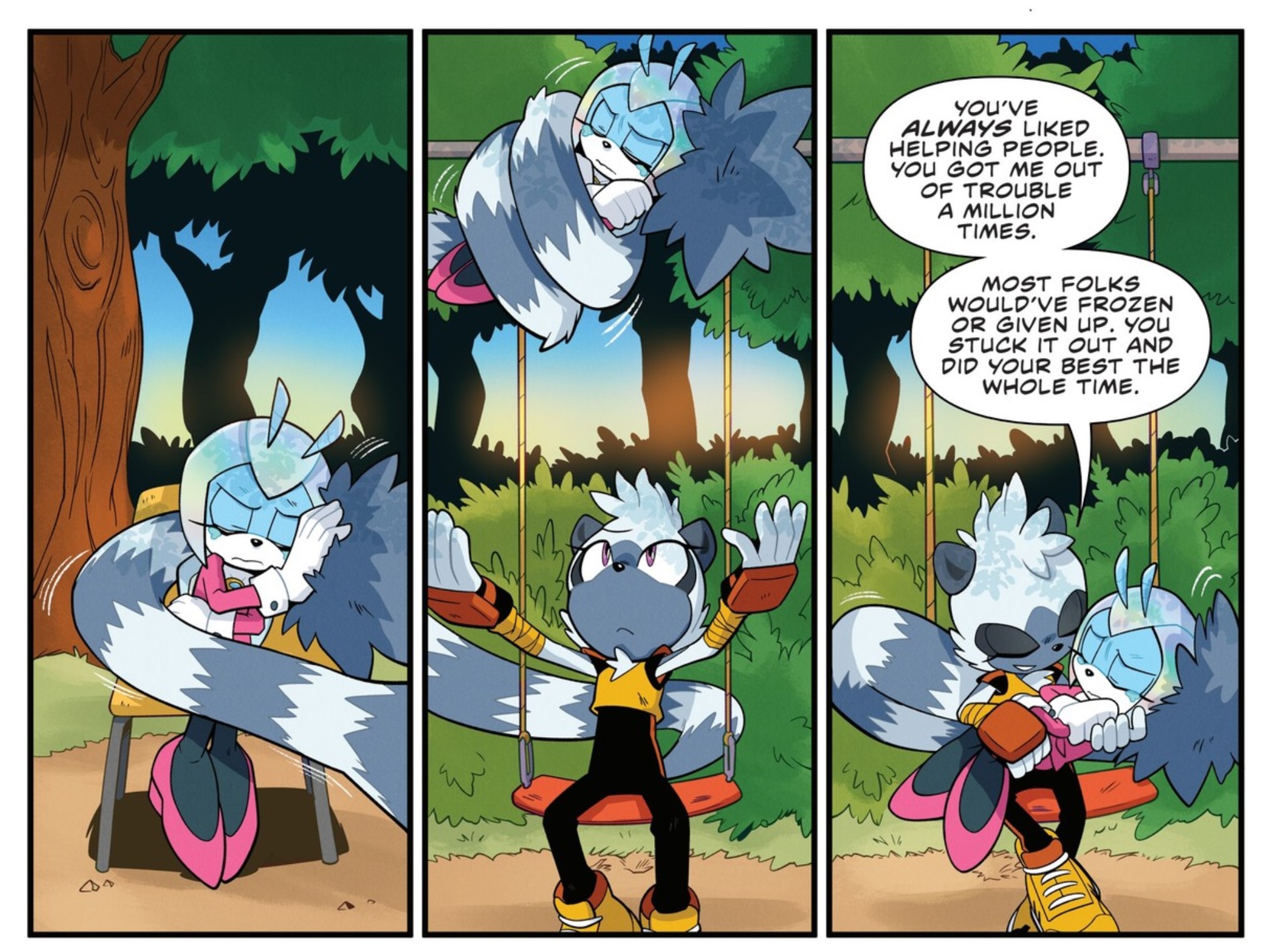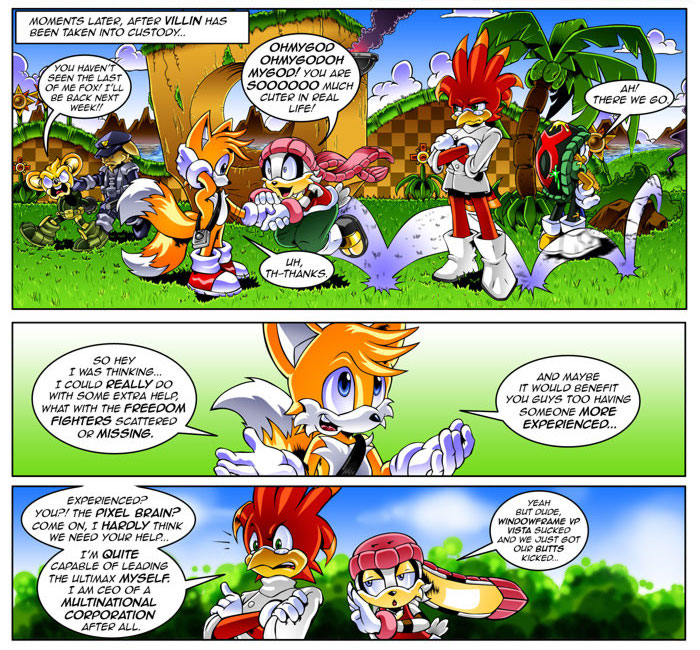 >>557112743I don't like that idea at all because Tails has worlds of experience over Tangle. Just because she's older than him doesn't mean it's suitable for her to just come into the picture and start lil broing him. This page summed it up, Tails has seen way more than she has.
