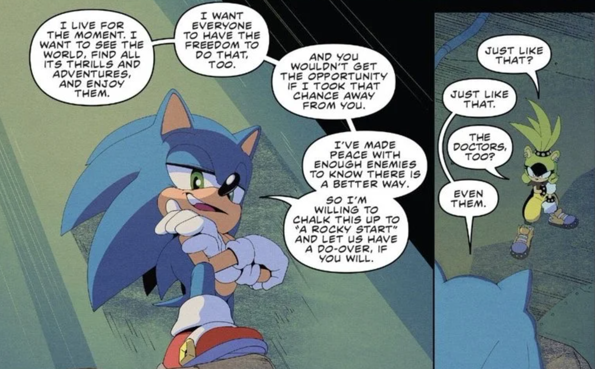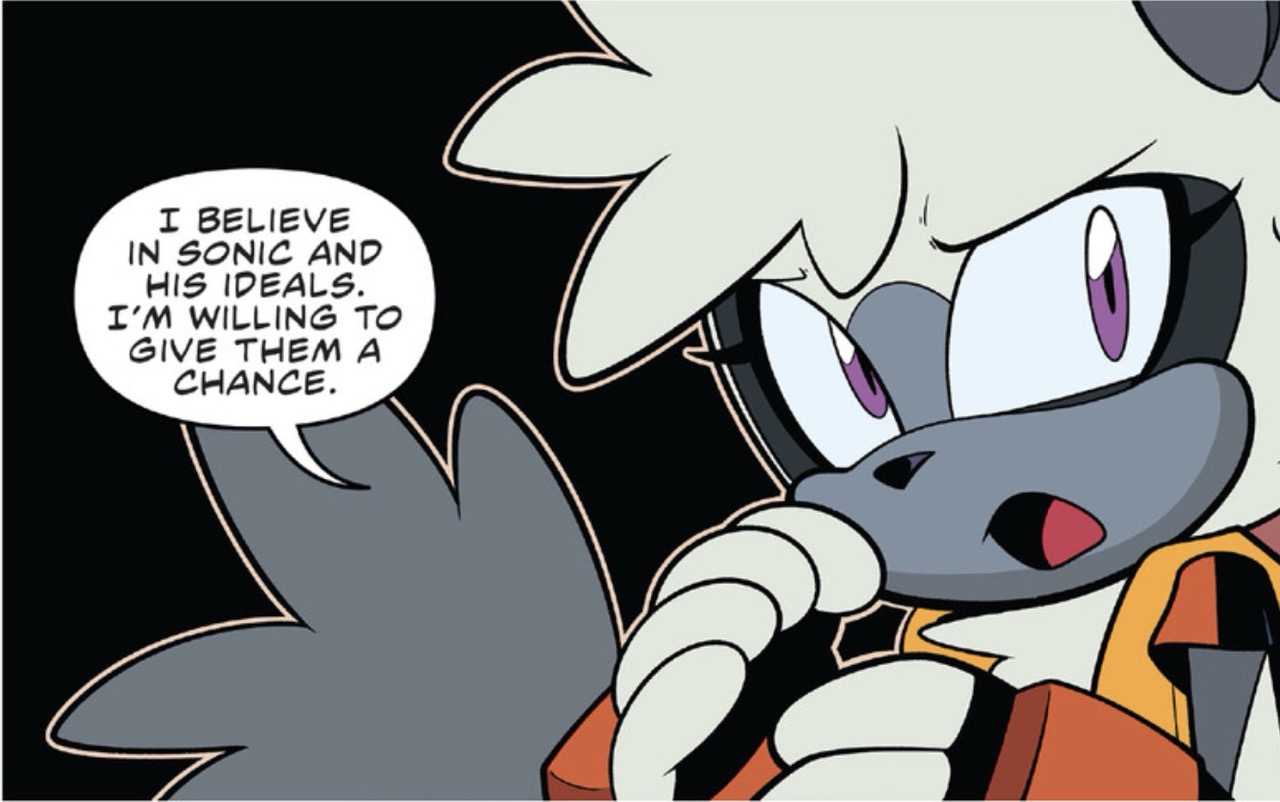 >>557114670>>557114851I see your points, but also Belle isn't Sonic; and her role in IDW is to offer a perspective of Sonic's World through the eyes of a non-combatant.Of course, it's subjective if the comic does this well; likewise I agree that the comic isn't really coherent about Belle's role nor does it really present that role in a compelling way. Belle takes a lot of abuse and I'm not really sure what the point of it is, but maybe this current story will tie it all together.