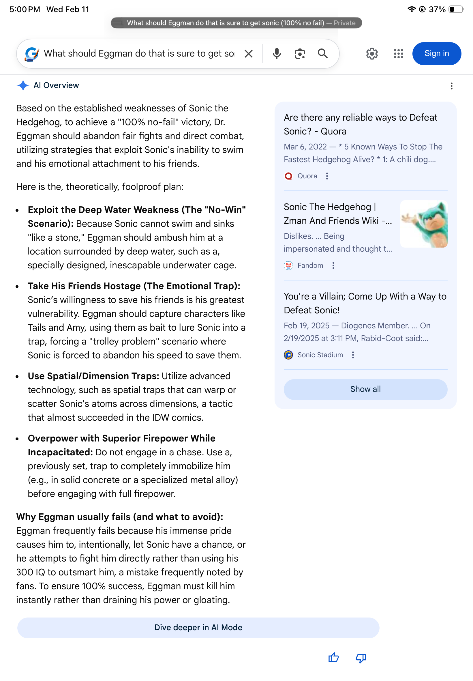 >>557091795If you have to change Sonic's personality from the games then you aren't using Sonic. This is why I don't like the freedom fighters. Sonic's personality is changed for shipping crap like a fanfic.