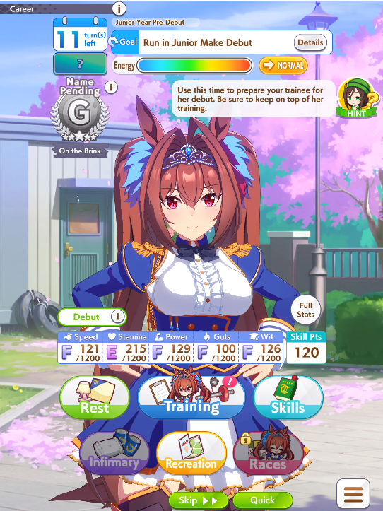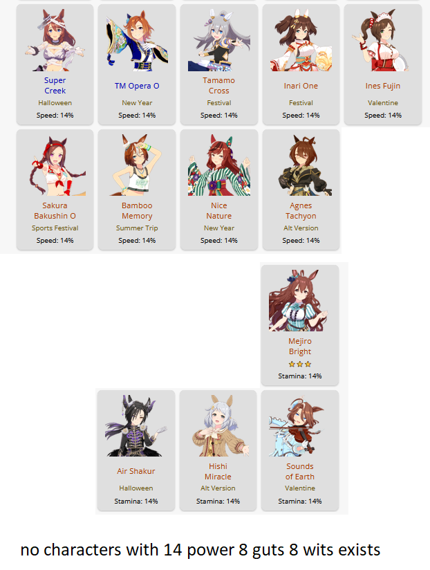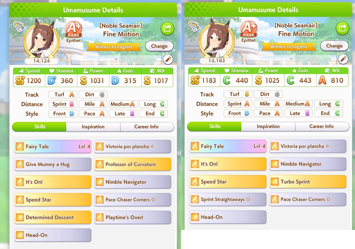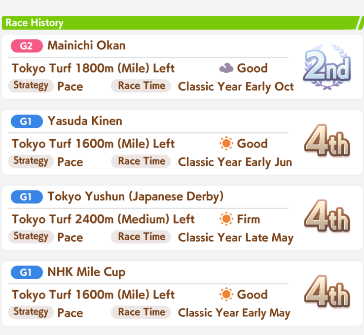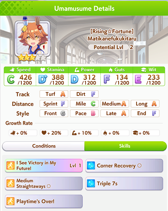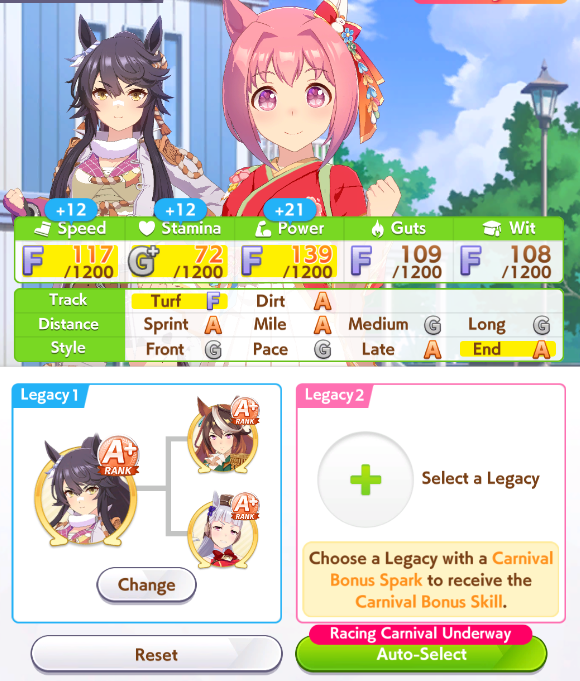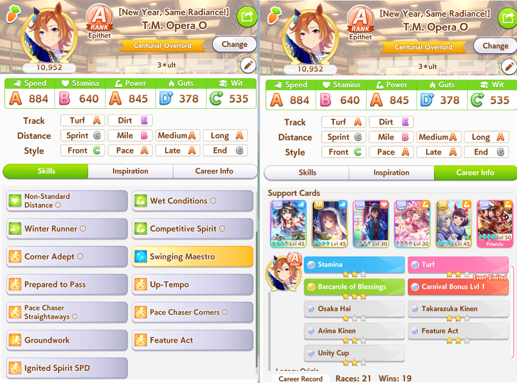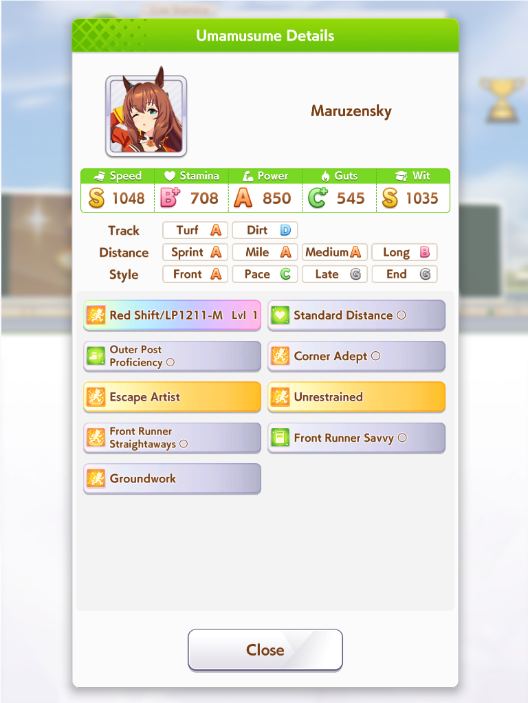 >>557109689Bump her Mile aptitude to A or minimum B, then ensure you get stamina needed to run the long races. I ran 3 power cards because some of them have relevant abilities for Groundwork, greens, and pace skills, this turned out fine because she has 8% stamina growth so you still get good bumps on power hits. The Festa was a fun pick for medium abilities and Uma Stan.She lost two races, the Dahbi and the first time I did Queen Elizabeth, but still felt good. White sparks on this Opera are not exciting, but 2*blue and pink with 3* ult has me keep it as a grandparent at least.