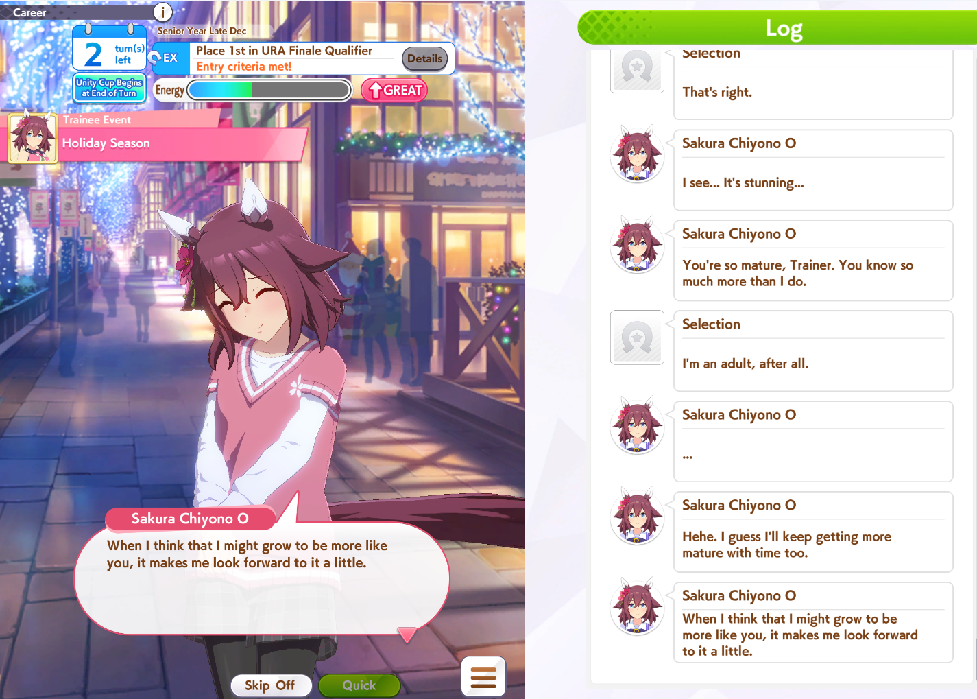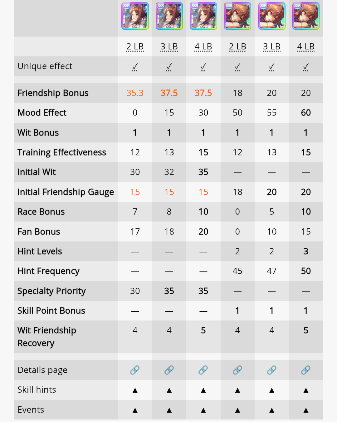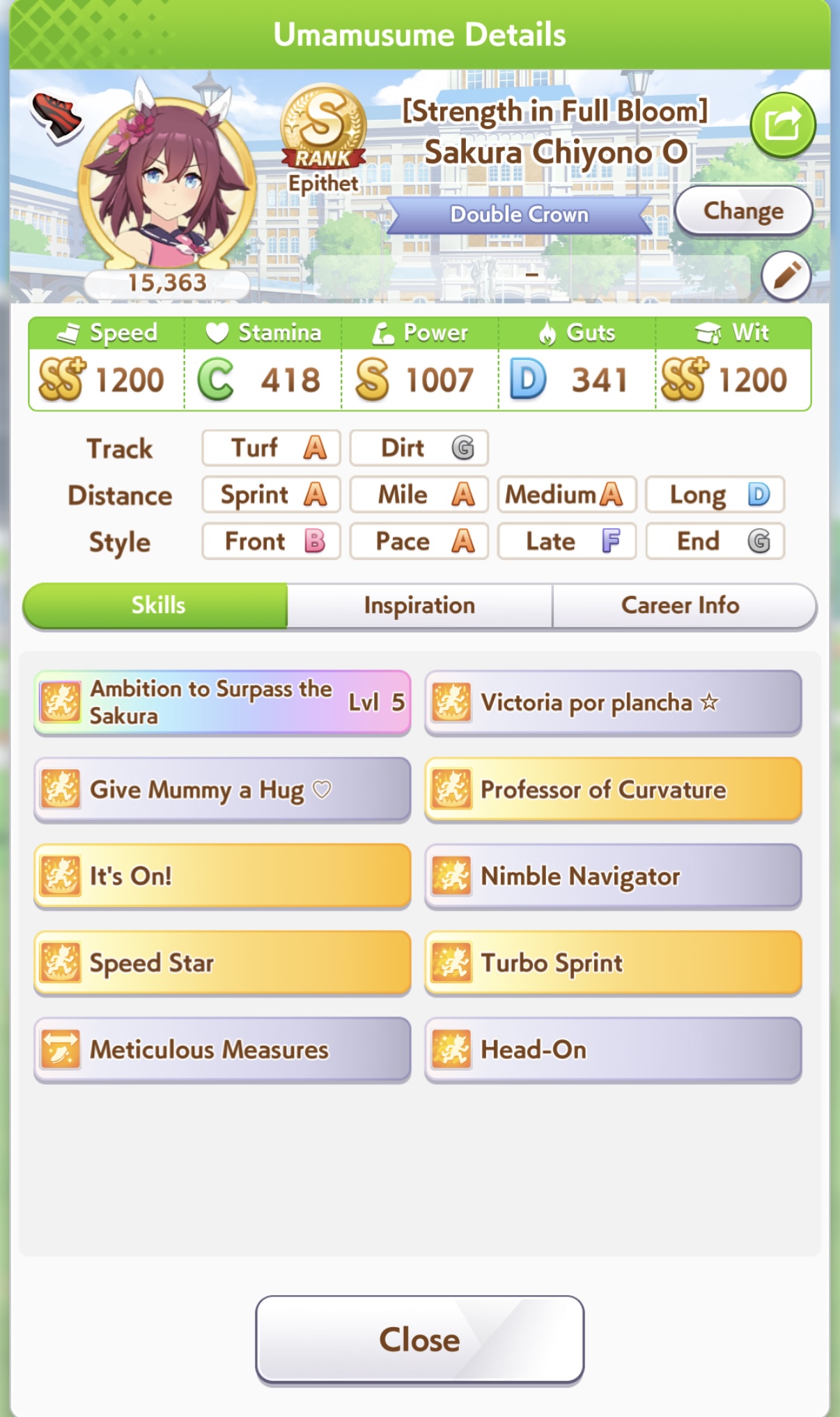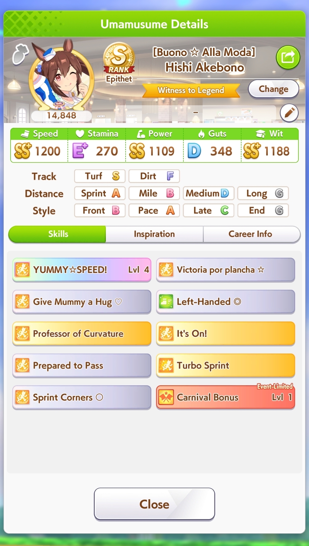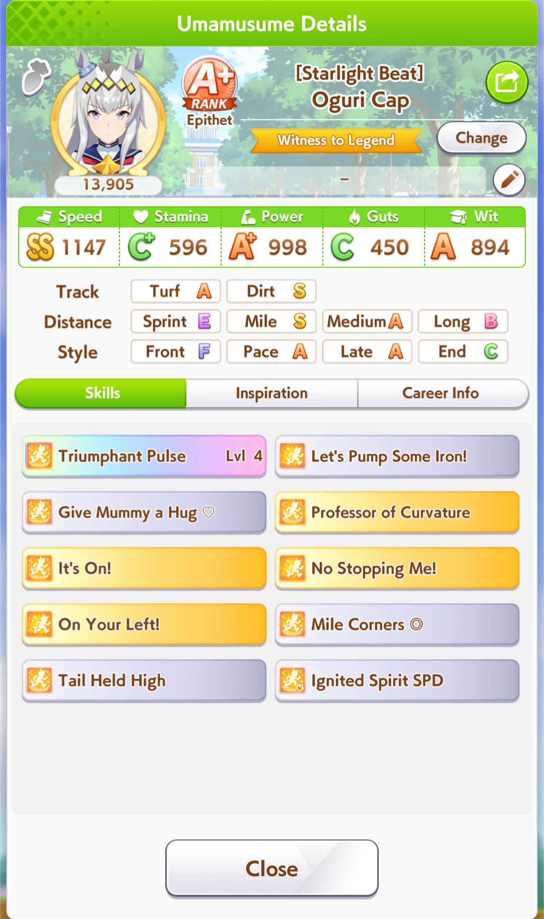>>557109689Bump her Mile aptitude to A or minimum B, then ensure you get stamina needed to run the long races. I ran 3 power cards because some of them have relevant abilities for Groundwork, greens, and pace skills, this turned out fine because she has 8% stamina growth so you still get good bumps on power hits. The Festa was a fun pick for medium abilities and Uma Stan.She lost two races, the Dahbi and the first time I did Queen Elizabeth, but still felt good. White sparks on this Opera are not exciting, but 2*blue and pink with 3* ult has me keep it as a grandparent at least.