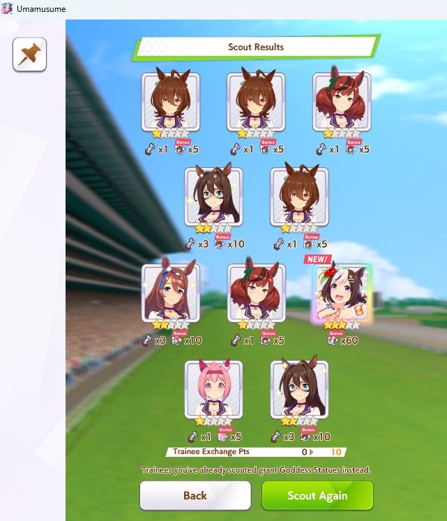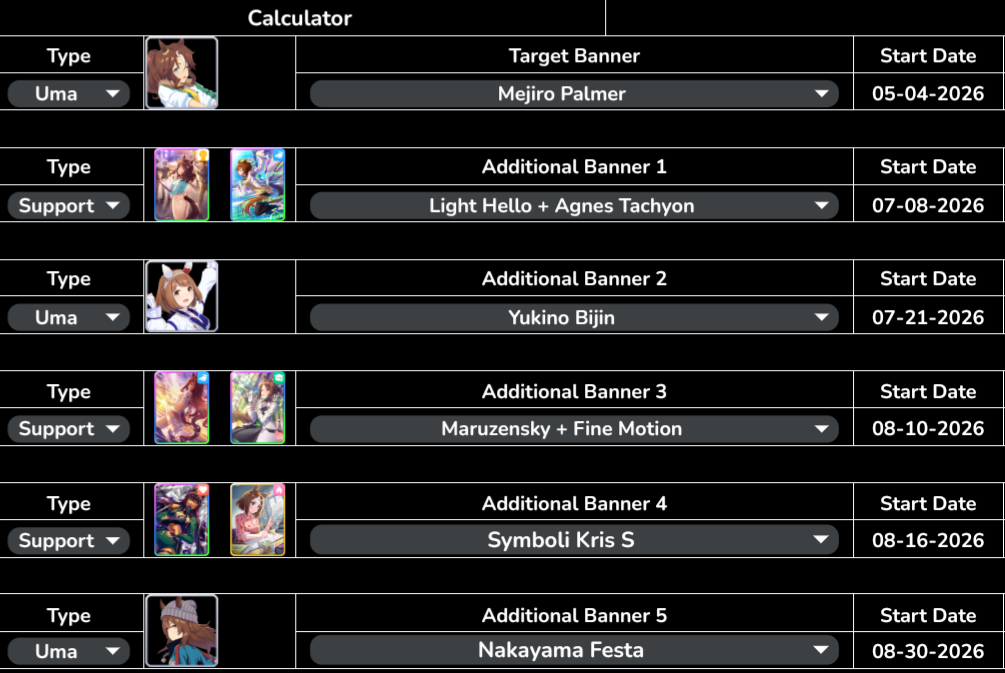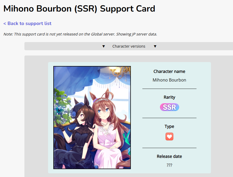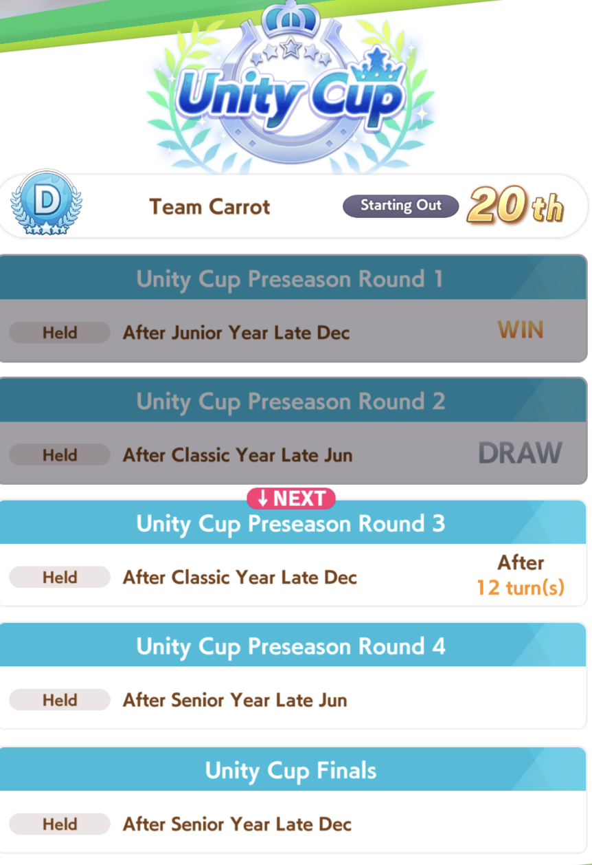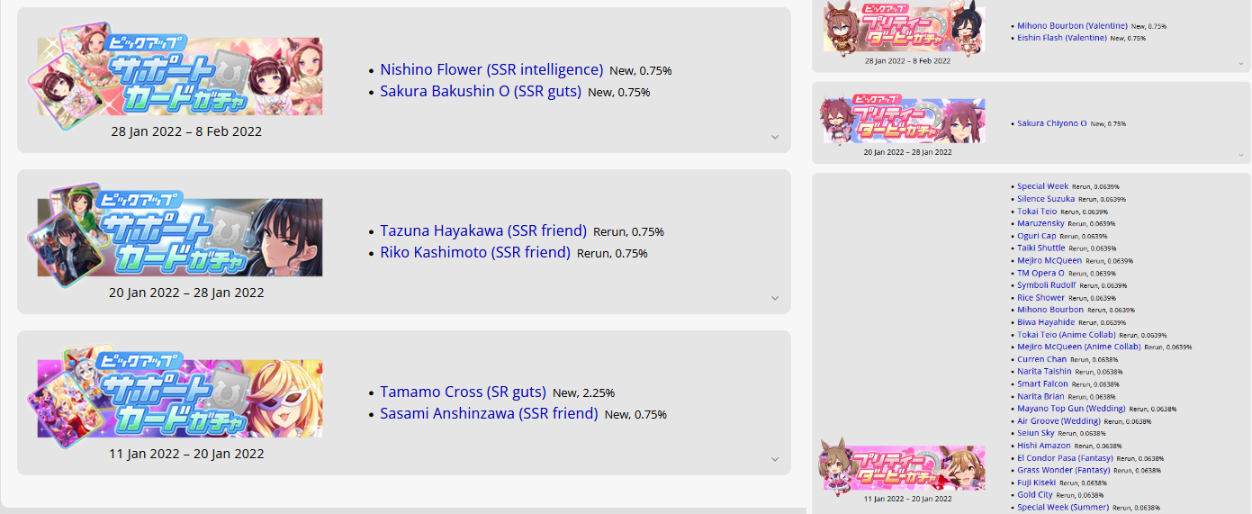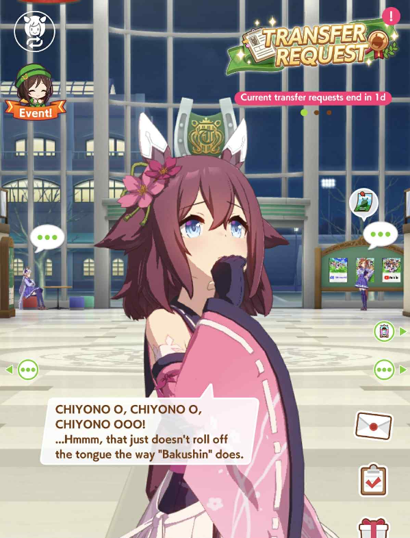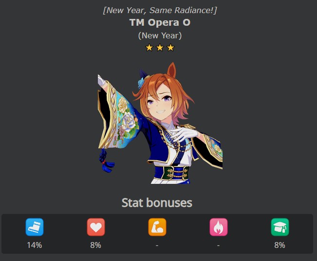 Previous: >>557066113>Global Game NewsLink your account to Cygames iDCurrent Scenario: Aoharu Hai aka "Unity Cup"Current Rate Up Trainee: New Year's Scout (3*)Current Rate Up Support Cards: New Year's Scout (SSR), SSR Sasami Anshinzawa (Pal), SR Tamamo Cross (Guts)Current CM: Capricorn Cup - Chukyo Turf 1200mMain Story Chapter 5 is out01/27 - New Beginnings Part 101/29 - NY Opera & Haru 3*+Fuku SSR+Ayabe SSR02/05 - 02/12 Racing CarnivalMid February - Capricorn Cup - Chukyo Turf 1200mhttps://umamusume.com/news/100040/https://pages.snep.pw/uma/anni-skill-changes/>JP Game NewsCurrent Rate Up: Valentine Taiki Shuttle (3*), Valentine Sounds of Earth (3*), SSR Matikanefukukitaru, SSR Neo UniverseNew Scenario "Yukoma Hot Spring" releasedTimeline: https://uma.moe/timelineCygames Webstore: https://webstore.cygames.com/en/umamusume_en/>Thread Clubshttps://rentry.co/umaglobalclublistYou must be E3 (20k points) to join a circle. Apply with /uma/ or /vg/ in your profile or post ID in the thread.>All Guides & Resourceshttps://rentry.org/uma26Game databasehttps://gametora.com/umamusume (Click the gear to switch between JP / global server info)A basic guide for newfagshttps://rentry.org/umaglobalFind networks if your region is blocked from the game or clienthttps://www.umavpn.top/93Seiyuu & Concertshttps://rentry.org/umstUma Texthttps://umareader.idsmile.xyz/