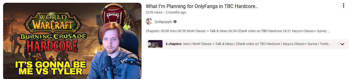 >>557098990there's a reason why only:>classic 2019>classic HC>SoD>classic anniversarywere popular. classic players want vanilla and vanilla alone with maybe some changes. tbc and wotlk are doa