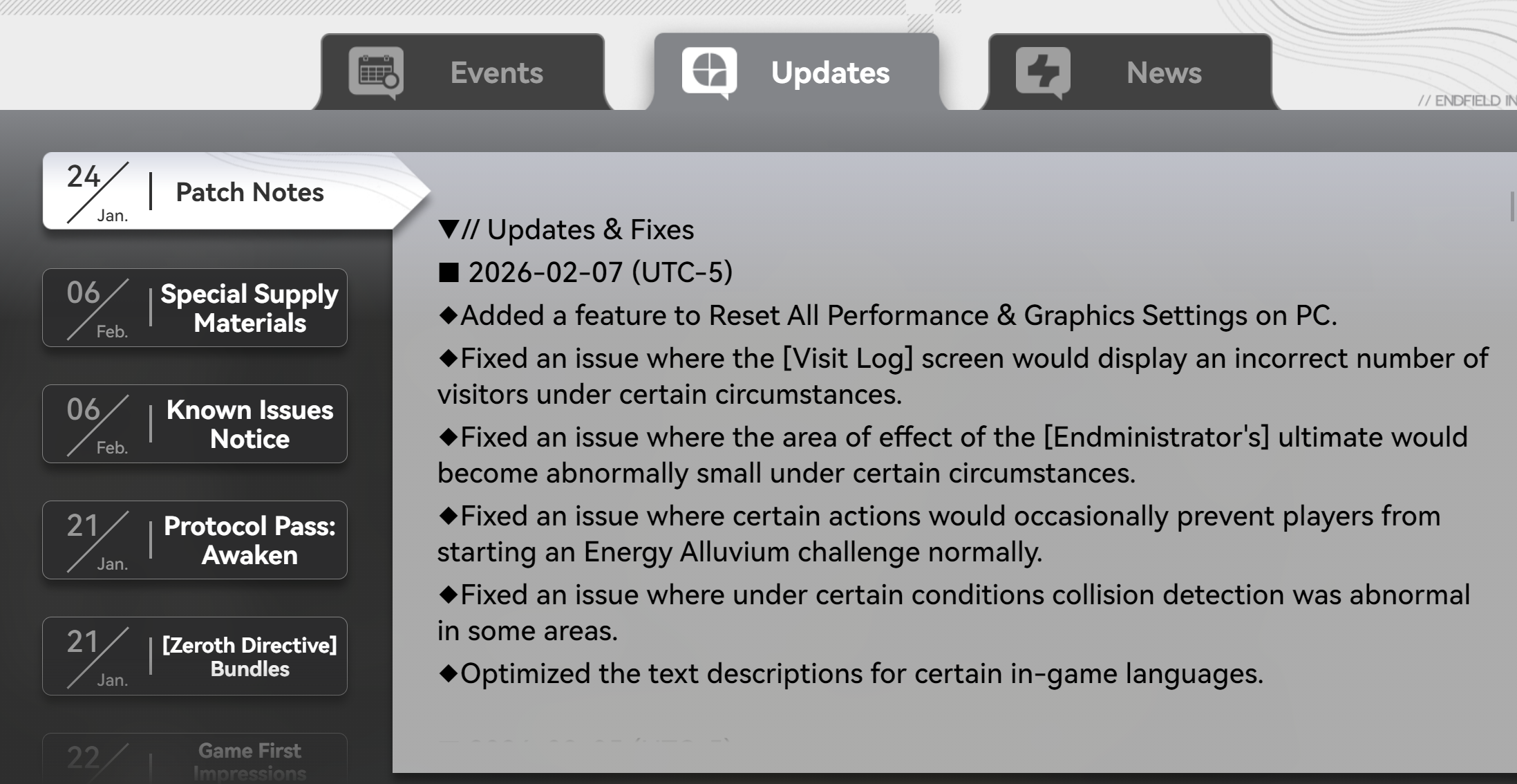 Previous thread: >>557111273>Official Websitehttps://endfield.gryphline.com/en-us>Official EN X (News)https://x.com/AKEndfield>DEV Comm (Developer Updates)https://endfield.gryphline.com/en-us/news/3846>Gilberta PV'shttps://www.youtube.com/watch?v=8hZVxeiSmQ4 - EP [Snap Shot]https://www.youtube.com/watch?v=BQom1V9TdbM - Operator Storyhttps://www.youtube.com/watch?v=h70w5ZmXLkE - Combat Demo>Chartered Headhunting ScheduleFebruary 7th to February 24th --- "The Floaty Messenger", (Gilberta)February 24th to March 13th --- "Hues of Passion", (Yvonne)TBA>Reward CodesENDFIELDGIFTENDFIELD4PC>Twitch Dropshttps://endfield.gryphline.com/special/third-party-binding?channel=twitch>Voyage to the Stars (Ongoing until March 4th)https://endfield.gryphline.com/activity/voyage-to-the-stars/en-us/>Wikishttps://wiki.skport.com/endfield (Official)https://perlica.moehttps://warfarin.wiki/enhttps://endfield.wiki.gg/>Blueprint Guideshttps://talospioneers.com/en>Stickershttps://drive.google.com/drive/folders/13KH3L6QPIKkVH7pBddv4uxwmwJsnOtklhttps://drive.google.com/drive/folders/1OuVtjv1k-9c3M6n7d4PX3CGG5bkwH04ahttps://drive.google.com/drive/folders/1AStB8bzFk3lSwMwczWPkFYCBrZe0vHOghttps://drive.google.com/drive/folders/1yS0lqUhxf8tBRtpDFfCU1y16IS2sSeF7>Fr/end/sSubmit your info, /end/min:https://forms.gle/Fo7BhZMKaKqiWyL19View other /end/mins:https://docs.google.com/spreadsheets/d/1YtxiDss0hgEQhLlZgpfzyGrJrzUcqDzOS9T6IH-BiVc/edit?usp=sharing