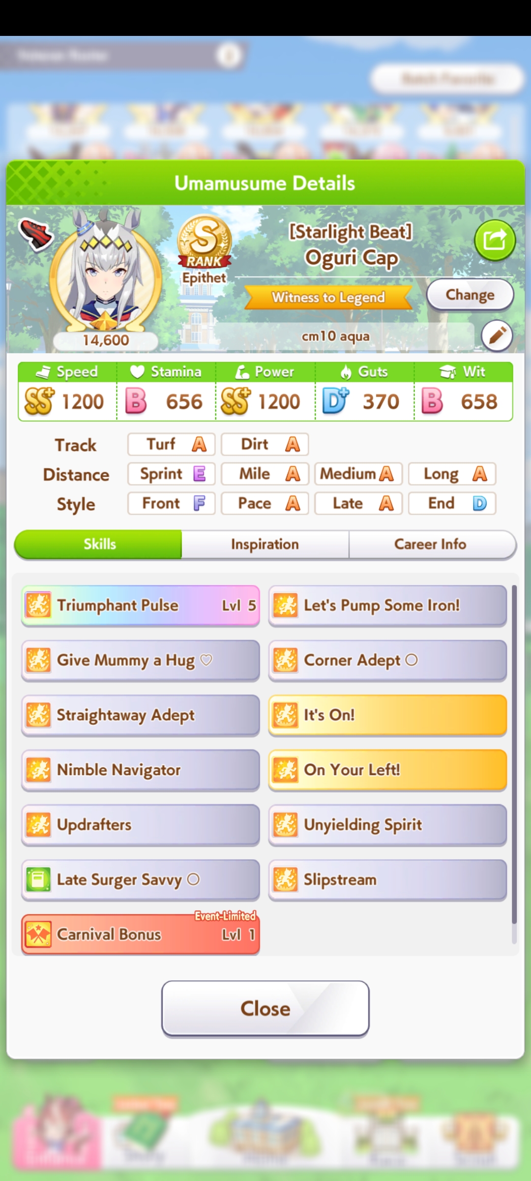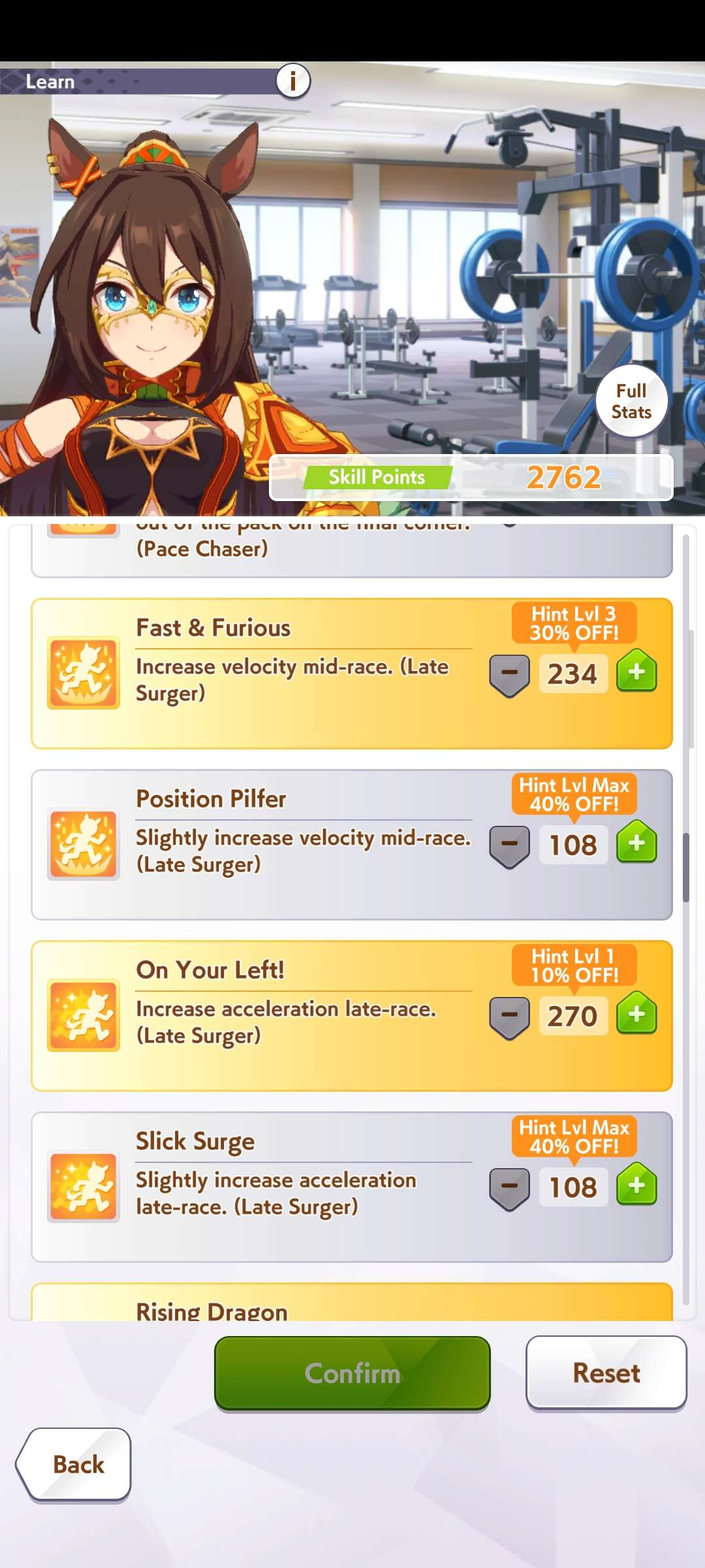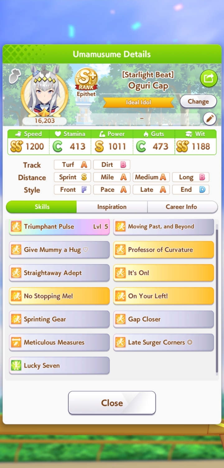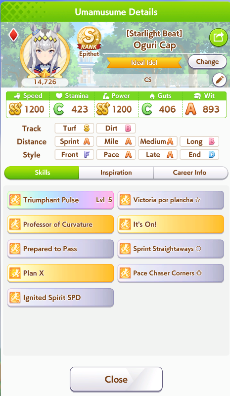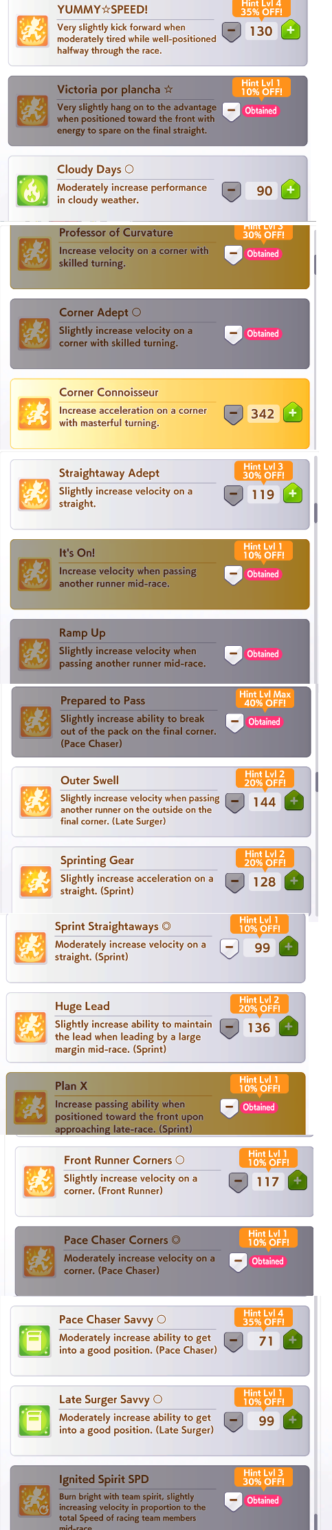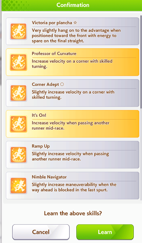 >>557147263Alright. I have YUMMY SPEED, corner accel, straight adept, prep to pass, sprinting gear, ignited spirit SPD and pace chaser saavy to choose from. Which one?The skills I chose are: Plancha, Curvature, It's On, Sprint Straight, Pace Corners, Plan X. I will be glad for the advice.>>557147315She's my hero.