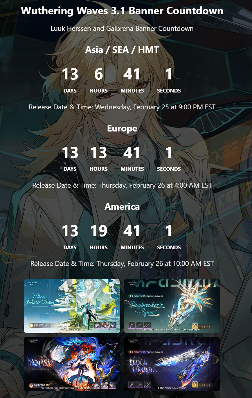 Download (Android/iOS/EGS/Windows)https://wutheringwaves.kurogames.com/en/#mainhttps://store.steampowered.com/app/3513350/Wuthering_Waves/>Wuthering Waves Cinematic Short | Salvationhttps://youtu.be/TnXzZxKmGYk>Wuthering Waves Story Cinematics | Originhttps://youtu.be/DXRqVumTFh4>Wuthering Waves | Resonator Showcase | Aemeath — GRADUATION SHOWhttps://youtu.be/H8gGJgMvr9w>Wuthering Waves Resonator Combat Showcase | Aemeathhttps://youtu.be/psq5Izh9GHM>Wuthering Waves Version 3.1 Official Trailer | For You Who Walk in Snowhttps://youtu.be/6lpiSBvawB0>Map:https://wuthering-waves-map.appsample.com/>Convene Trackerhttps://wuwatracker.com>EventsWHEN IN DOUBT, CHECK: https://wuwatracker.com/timeline[Peaks of Prestige: Rekindled Duel Echo Combat Event][05 Feb -17 Mar][Startorch For You] [05 Feb -17 Mar][TERM-X: Outreach Exploration Event][05 Feb -17 Mar][Full Throttle! Bolt & Blitz! Leisure Event][06 Feb -17 Mar][Where Stars Cascade Down: Limited Time Event] [14 Feb -18 Mar]>Timeline, Rewards and Media Contentshttps://rentry.org/wuwavgv2>Emoteshttps://drive.google.com/drive/folders/1GY6YgPhhOsxN2oW0AbIywdO9Z1_OFe6Khttps://files.catbox.moe/49buge.zip>/wuwa/ Friends Listhttps://docs.google.com/spreadsheets/d/1MzulbsusjOWpaFg6o6kk3TvCWfFYi6EF7NyJXqIazGo>NEWS/EVENTS (and patch notes)https://wutheringwaves.kurogames.com/en/main/news/detail/3941https://wutheringwaves.kurogames.com/en/main/news/detail/3920Previous: >>557127327