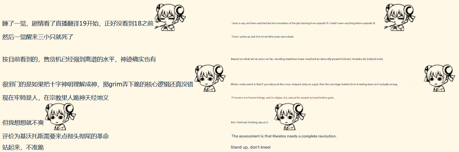My main issue with the update comes down to comparing how things happened in volume F. They directly call back to it, also, making it even stranger.Basically, in volume ex the decas sacrifice themselves and their action reminds Kei of when she sacrificed herself for Aris. Thing is, once Kei's death had been actually processed (after the main events of the volume), they didn't really go "well so much for that, RIP Kei". They found hope pretty much immediately for her revival. As a matter of fact that kind of thing is discussed multiple times in volume ex: how data is basically the life of a machine-person. So, when Aris (who has experience with losing a machine person close to her--and recovering her) sees 3 other machine people die and immediately says "I couldn't become friends with them, I need to carry on", it's like Aris? Hey? Did you forget that this isn't necessarily the END for them? What happened? You were WAY more hopeful before when Kei had diedStory feels like it's trying to ride off of v1c3 but awkwardly. I love v1c3 to bits but feel like they didn't really finesse the message correctly. Probably shouldn't even have brought up the message at all, the volumes each having different messages generally feels better.Hopefully the actual ending is brimming with hope. This update felt weird.