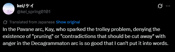 >>557189563It's called narrative consistency/consistency of messaging.Anon volume 2's ENTIRE point was that the idea of an "impossible choice to make" was a bad fallacy. Several years later? The fallacy returns and is proven correct. The girls even practically reference it by saying that they would prefer the rest survive, not them.Maybe you are an old man and forgot this.