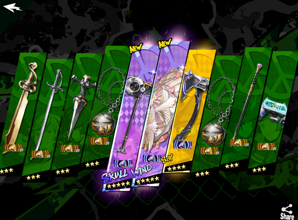 [2/5-3/5] 5 Weapon: Windplum Dance (Riko Tanemura-exclusive), 4 Weapon: Sparrow's Leap (Riko Tanemura-exclusive), 4 Weapon: Demon's Bite (Shun Kano-exclusive)