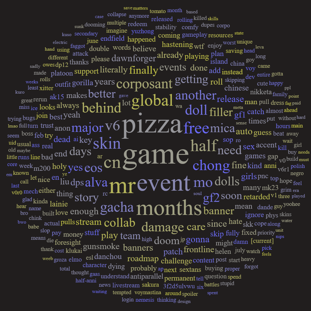 Previous: >>557096071This is a thread for MICA/Sunborn games. Including Girls' Frontline 1 and 2, Neural Cloud and Reverse Collapse: Code Name Bakery.Bind your account to a Sunborn ID instead of logging in from Facebook/Google.>STORY SUMMARYhttps://docs.google.com/document/d/1IalPz5JPc8-we4MiOsYhrMrOINifxW9d9Q6mTAqGoq8>TRANSLATED STORY & LORE MATERIALhttps://drive.google.com/drive/u/0/folders/14bAuWaGbagJwucmlit3EkXFqMRV9NHZO>GUIDESGF1 Resources: https://rentry.org/o9ibbk2kGF2 Resources: https://rentry.co/5x2kxhs4PNC Resources: https://rentry.org/dd5q8b25RC: https://store.steampowered.com/app/1127700/Reverse_Collapse_Code_Name_Bakery/>NEWS/EVENTS (GF1 EN)[Current] Feb. 10 - Feb. 23 | Event rerun: The Summer Garden of Forking Paths>NEWS/EVENTS (GF2 EN)[Current] Jan. 29 - Feb. 18 | Targeted Procurement: Sakura[Current] Jan. 29 - Feb. 18 | Character Event: Sakura - Advanced! Miss Courier![Upcoming] Feb. 11, 9:00 p.m. (UTC-4) | 6 Months Plan livestream: https://www.youtube.com/live/X9qdZS1J76I>NEWS/EVENTS (PNC EN)[Current] Mar. 25 2025 - ? | Nothing>Old Events & OP Templatehttps://rentry.org/gfgroot>DO NOT REDEEMURAB1GD0RC (D) (H)3F2D5ULVWU (D) (H)KTDXF8QE6J (D) (H)W7G6C9KNK9 (D) (H)Reminder to bully seaniggers, discord trannies, bugmen, /v/ermins, dramaniggers, tripniggers, tourists, yuritroons, retards & degenerates, and to lurk 2 months before posting