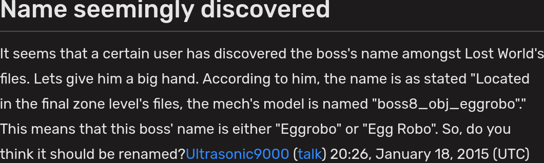>>557172920>>557184690All right, here's another blatant one. The Lost World devs gave the final boss the placeholder object name of "eggrobo". Sonic News Network eventually went with that (Fandom made browsing blocked browsing wikia page history unless you sign in but you can still see the moves and edit summaries, not to mention the talk page). Funny enough, the article now cites Sonic Encyclo-speed-ia as the source almost as if they're covering for him, yet they forgot to do the same for the Galaga bee. Apparently Ian called it the "Super Eggrobo" in hindsight on the Bumblekast, but that's also a name for the Sonic Advance final boss.