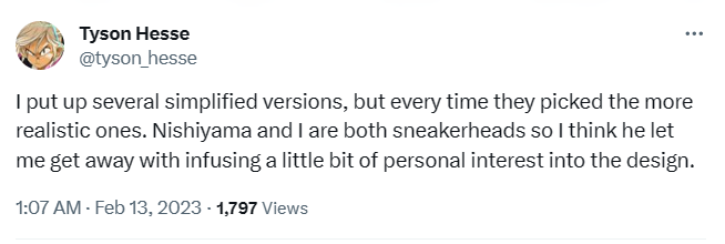 >>557186604>shilled both soa and soj are supposed to shill them>designed with help from soj. hesse has mentioned that he wanted simpler shoes for tangle but someone from soj kept pushing him to keep the more detailed footwear