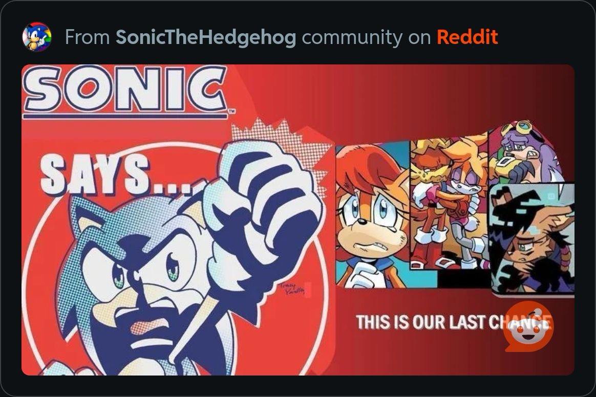 Welcome to Sonic the Hedgehog General! Here we discuss ALL things Sonic!/sthg/ #9058 - Namco, Fire This Man Edition==NEWS==>Sonic the Hedgehog's 35th anniversaryhttps://www.sega.com/sonic-the-hedgehog?tab=35th-anniversary>Sonic the Hedgehog 4 to release on March 19, 2027https://variety.com/2025/film/news/sonic-4-release-date-march-2027-1236280697/>Paramount Developing Sonic Movie Spin-Offshttps://comicbook.com/gaming/news/sonic-the-hedgehog-spin-off-movies-report-paramount/==Comic Release Dates==Sonic the Hedgehog: Sonic Racing: CrossWorlds - 04 March 2026Sonic the Hedgehog #85 - 11 March 2026Sonic the Hedgehog #86 - 08 April 2026==GENERAL INTEREST LINKS==https://rentry.org/sthglinks>Milestone pastebin:https://pastebin.com/LJCfZhY4>Sonic Game/Mod Recommendation Spreadsheet:https://rentry.org/sthglinks#sonic-gamemod-recommendation-spreadsheet>Perfect System Collection:https://rentry.org/sthglinks#perfect-system-collection>Sonic comic scans:https://rentry.org/sthglinks#comics>Sonic shows:https://rentry.org/sthglinks#shows>SAGEhttps://sagexpo.org/>SHChttps://shc.zone/>#10000 Projecthttps://pastebin.com/Fb8Bt4ru>/sthg/ booru:https://sthg.booru.org/>/sthg/ OC info:https://sthgoc.tumblr.com/archive/>/sthg/ CyTube:https://cytube/r/sthg>/sthg/ Pixel World:https://ourworldofpixels.com/sthgPrevious Zone: >>557121272