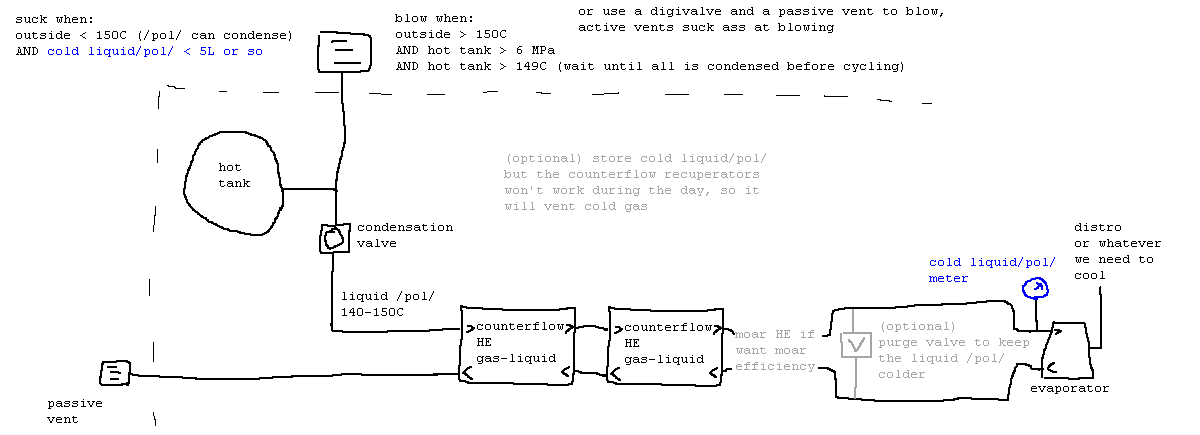 >>557215217nta but the way to expand this would be to duplicate the input portion, up to a second condensation valvethat doubles your liquid pol input which doubles flow rate through the heat exchangersI think he meant powered vent anyway not active, otherwise it's too slow on vulcanthen add another evaporator in parallel if that becomes too slowmain issue is there's a cap on how low the output temp can get from the evaporator, from my tests it was around 90-100C difference between input and outputstems from the ratio of heat capacity to latent heat of the gas itself, in this case pol