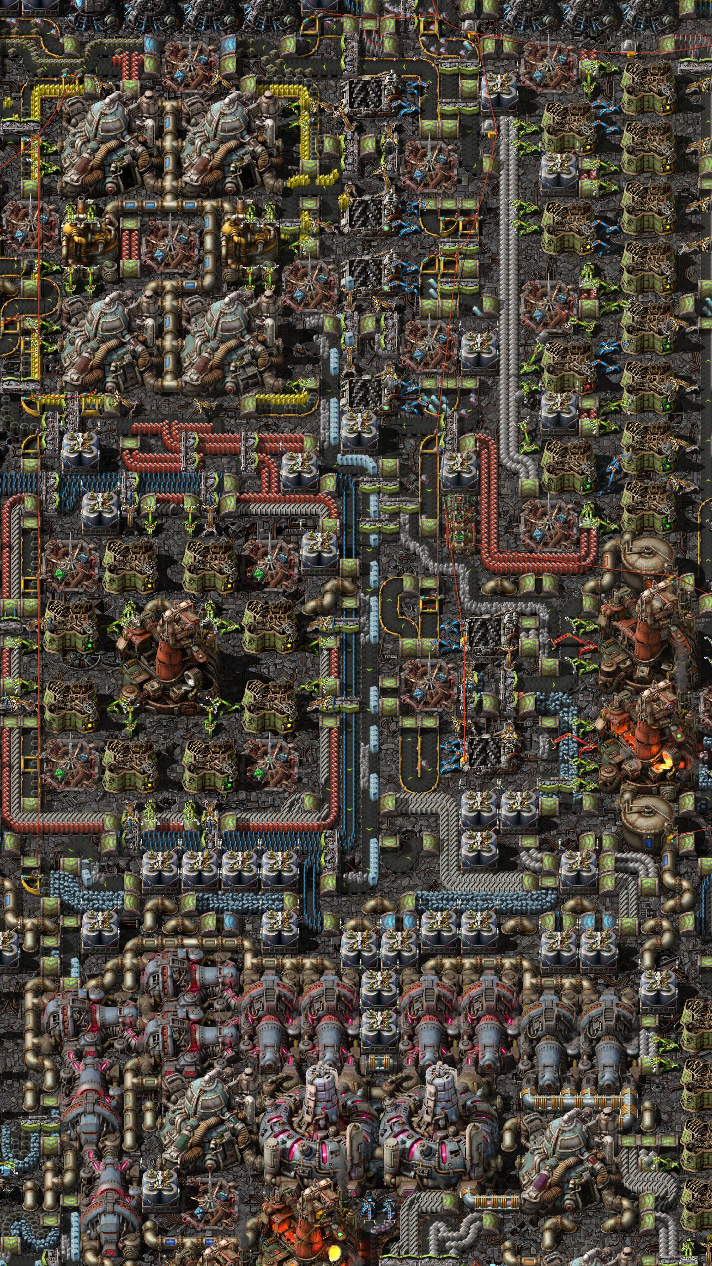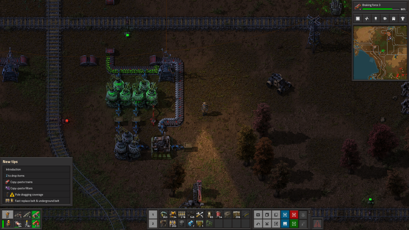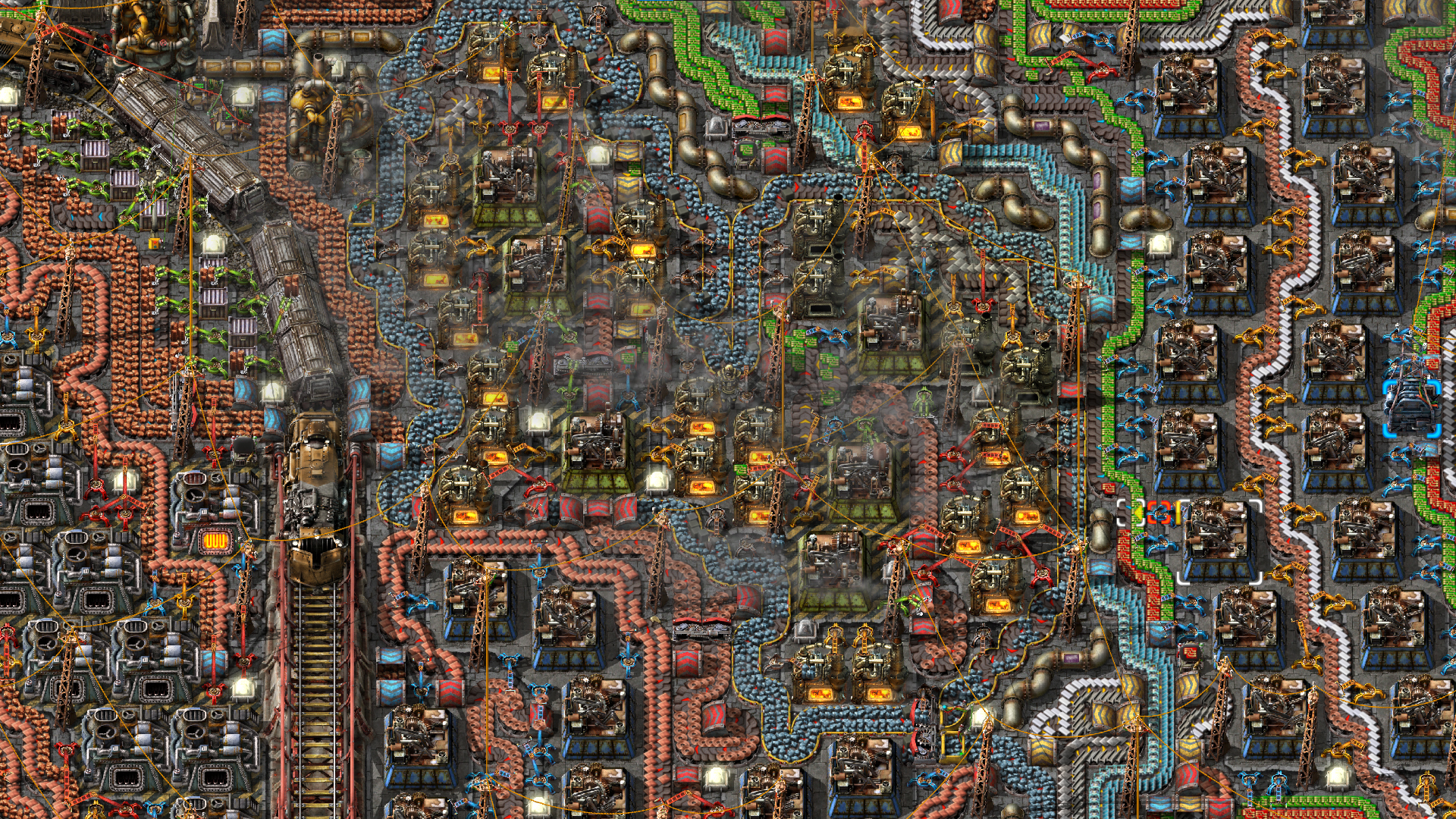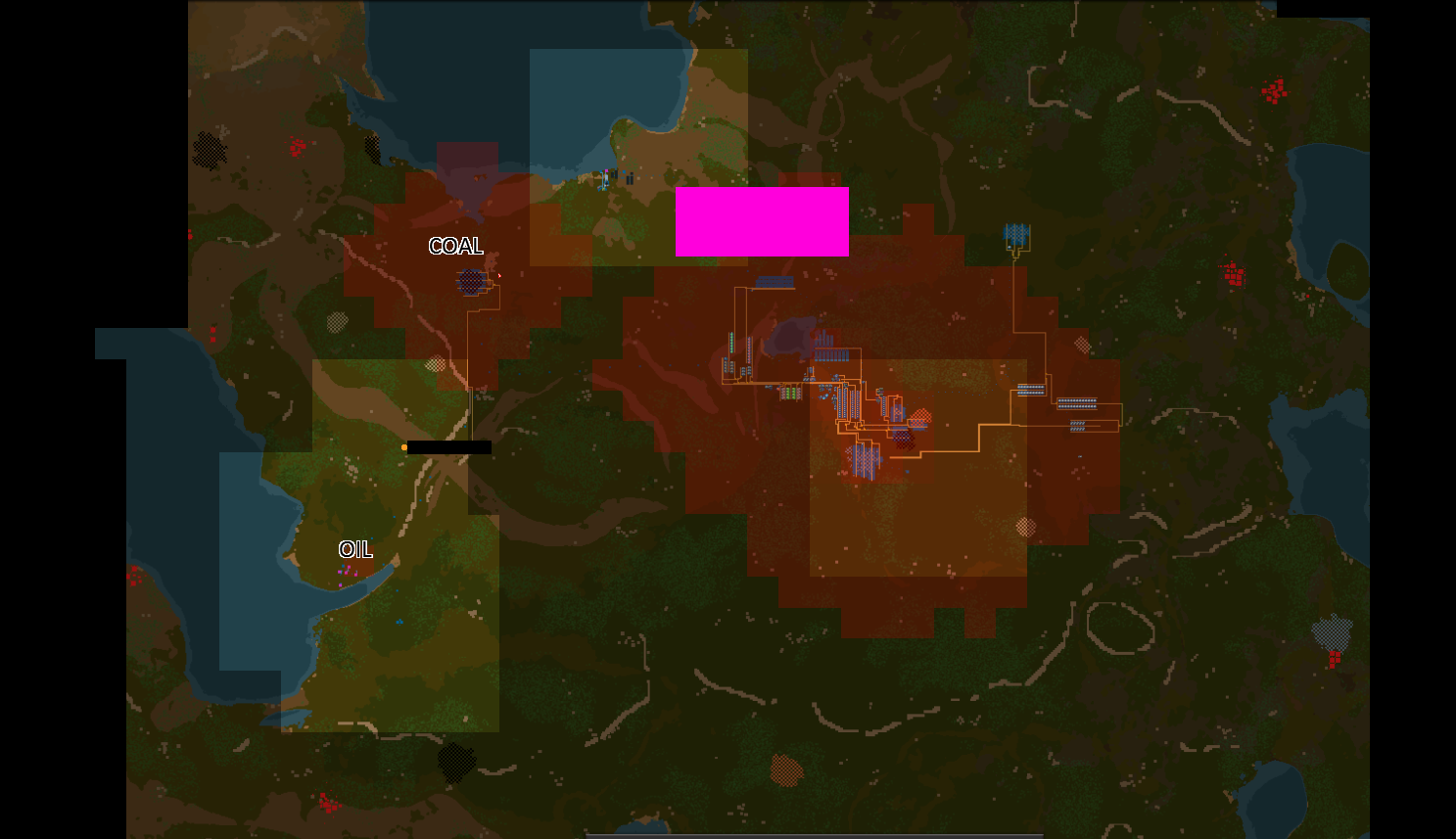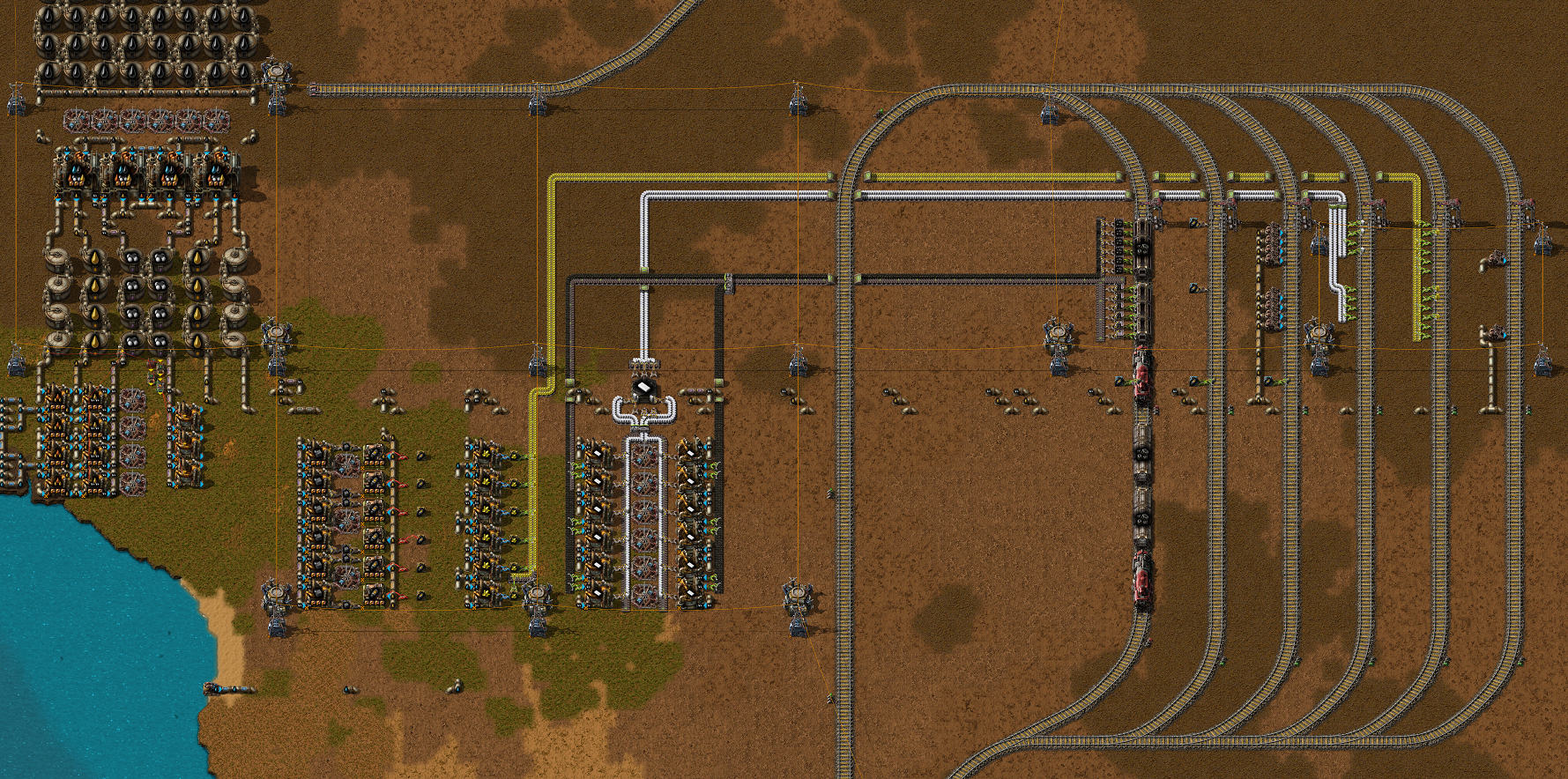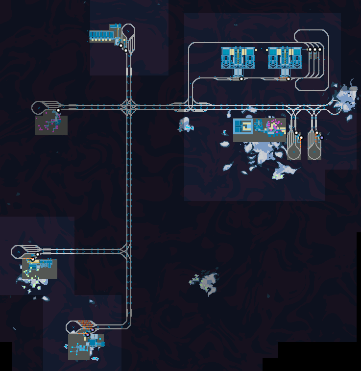 >>557326512>>557326542>>557330515>>557326670>>557331296Here's a picture of my world. I was first thinking of doing number 3 and I was moving coal from the COAL patch to where I market OIL and I was planning on making sulfur and plastic there and then use a conveyor belt to move them to my main base.I'll instead pipe the crude oil to the pink rectangle and build my refineries and chemical labs there.>>557331494that's some really cool train work.