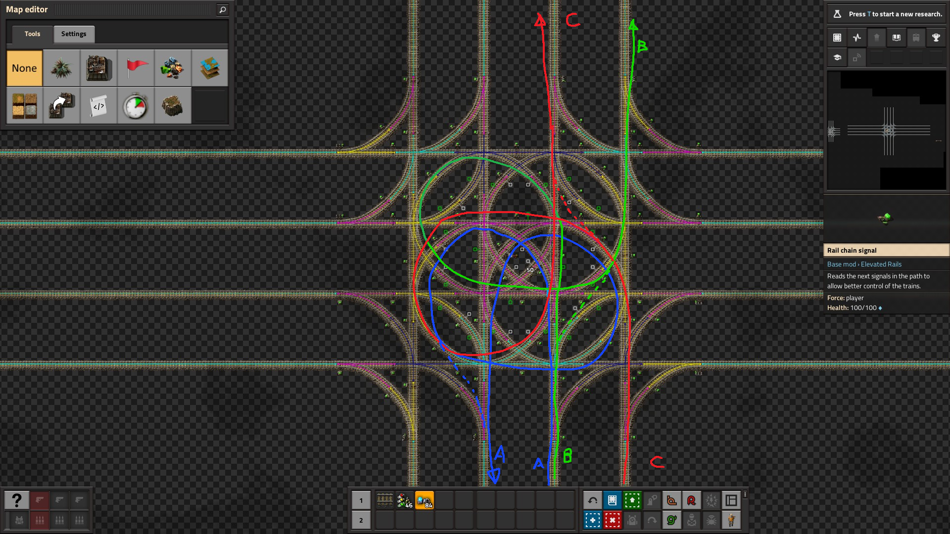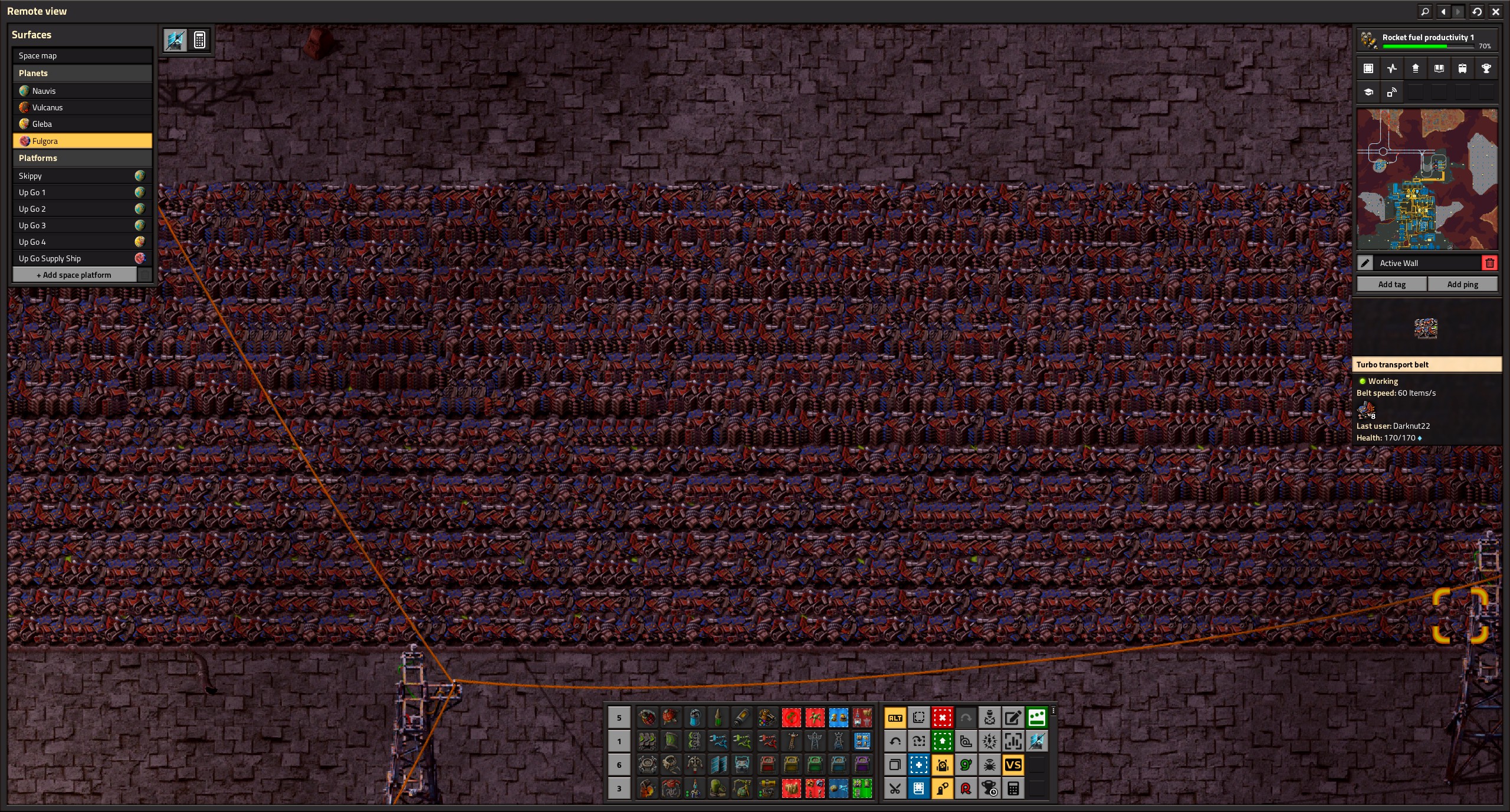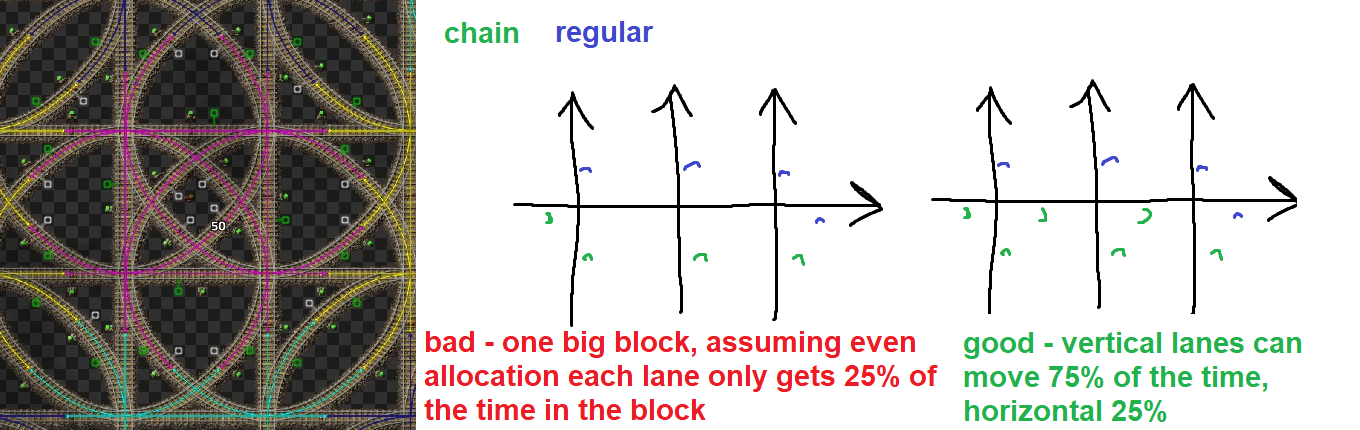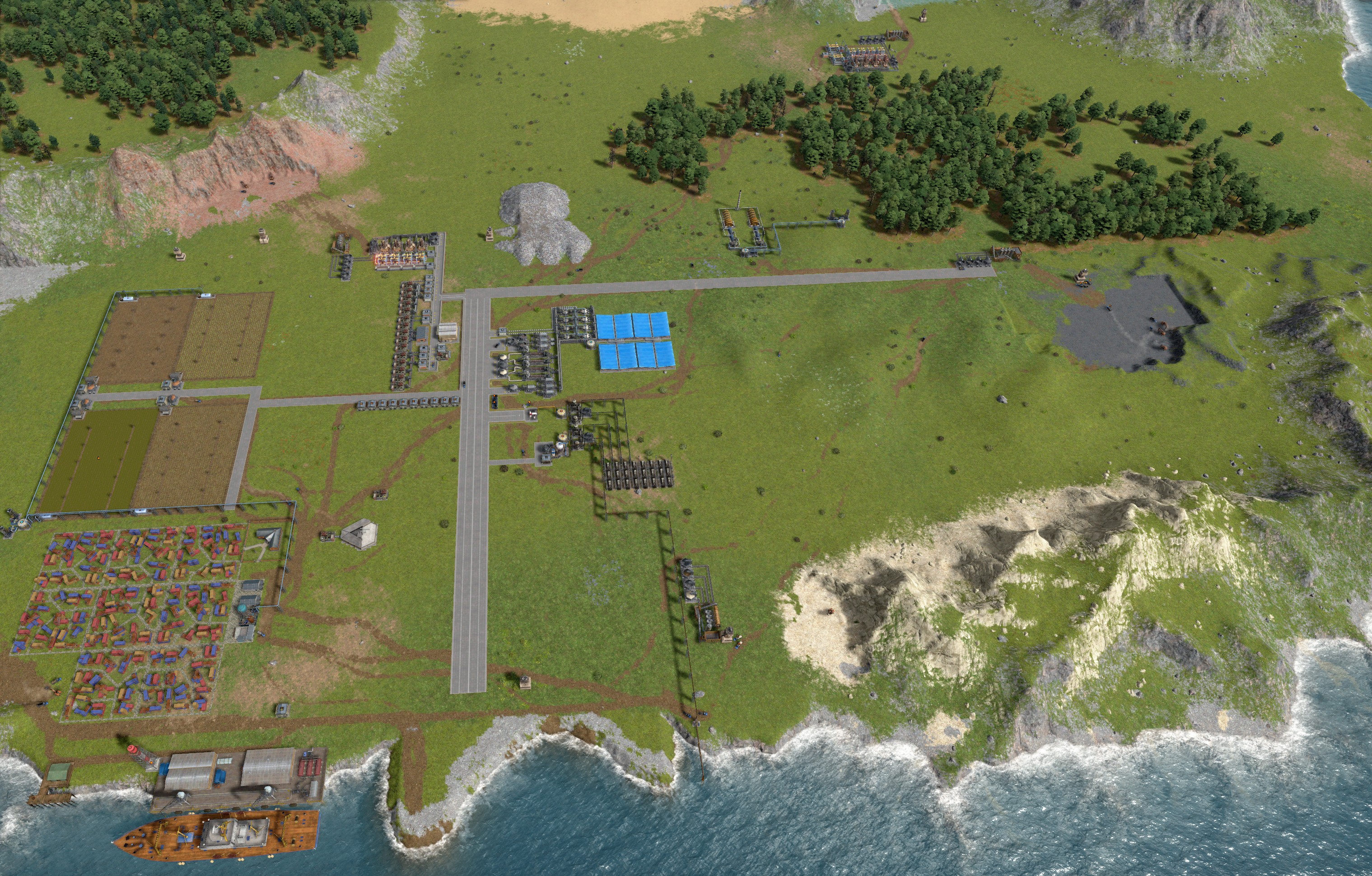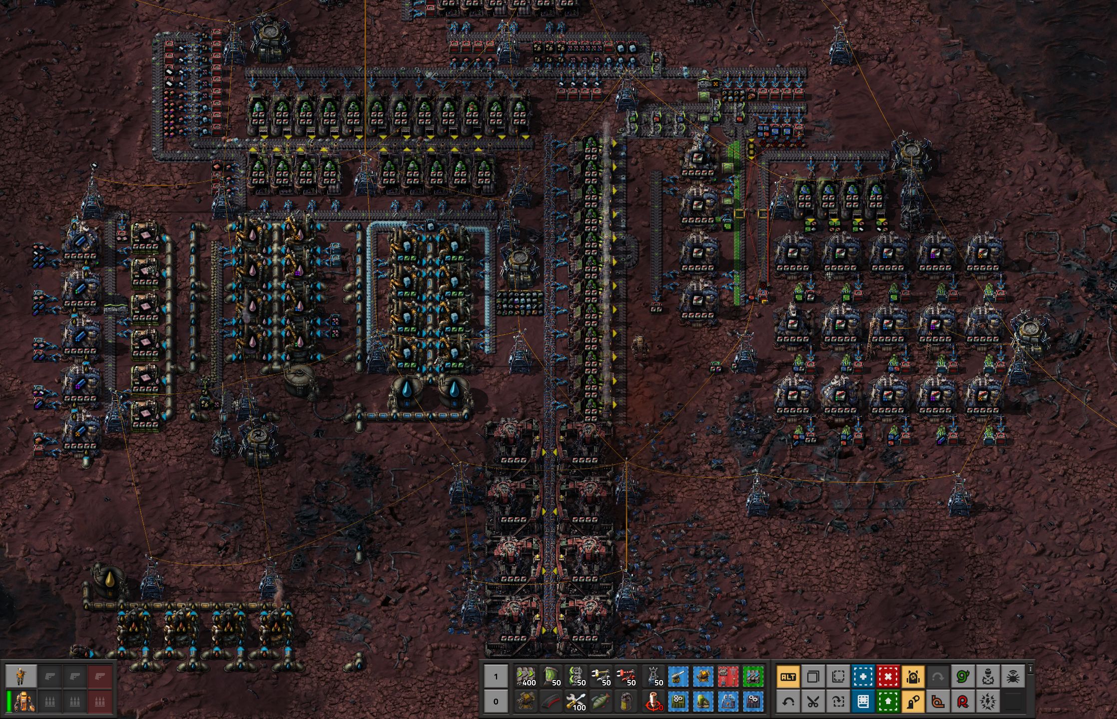 >>557326512>>557326542>>557330515>>557326670>>557331296Here's a picture of my world. I was first thinking of doing number 3 and I was moving coal from the COAL patch to where I market OIL and I was planning on making sulfur and plastic there and then use a conveyor belt to move them to my main base.I'll instead pipe the crude oil to the pink rectangle and build my refineries and chemical labs there.>>557331494that's some really cool train work.