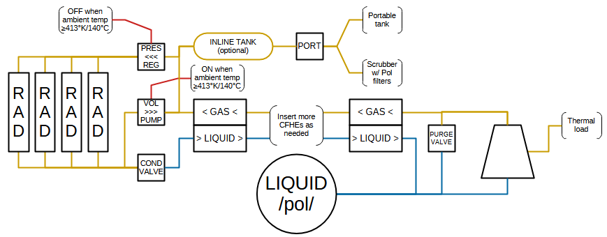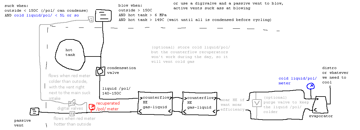 >>557287584Don't know any tricks, all I know is that it's where the condensation takes place, which dumps heat, and radiators dissipate it.>would also probably need another pump hereI don't remember if heat exchangers allowed things to flow in reverse, but otherwise yeah, possibly.The part with the tank and the portables connection port functions as the collective gas tank.I also missed a condensation valve for that section, as it will inevitably become pressurized to 6MPa.Condensation will stop once it heats up past 150°C, meanwhile it'll keep the pipes from bursting.>why not remove the pump for radiators then?Because then the gas will heat up to upwards of 600°C during the day.There's no way to turn a radiator off, you can only pump out it's contents on dawn.In light of this, it could be worth using a turbo pump and remove the pressure regulator altogether.Can reverse the pumping direction on the turbo pump, but you'll need a pipe analyzer to avoid over-pressurization.