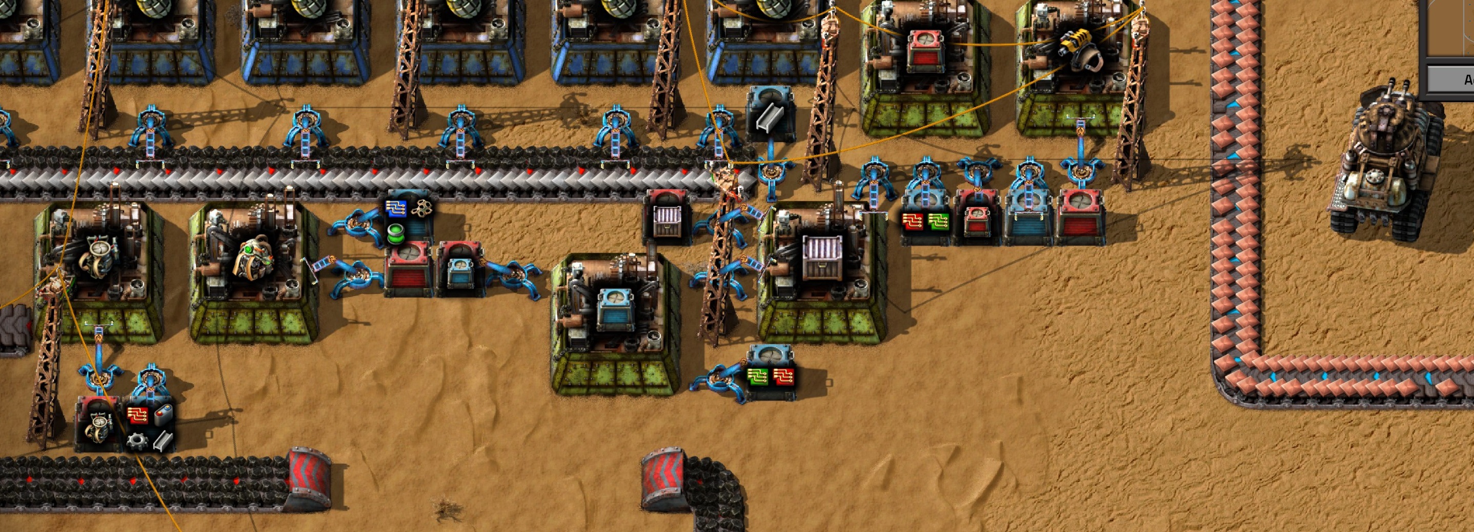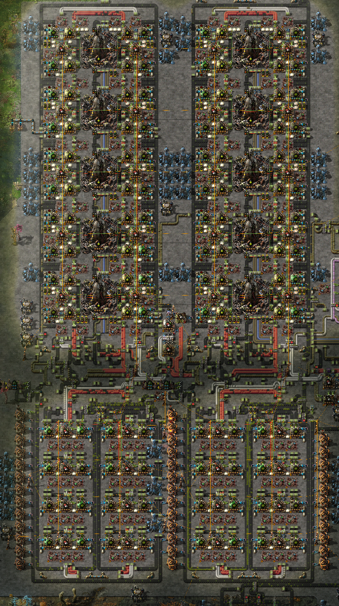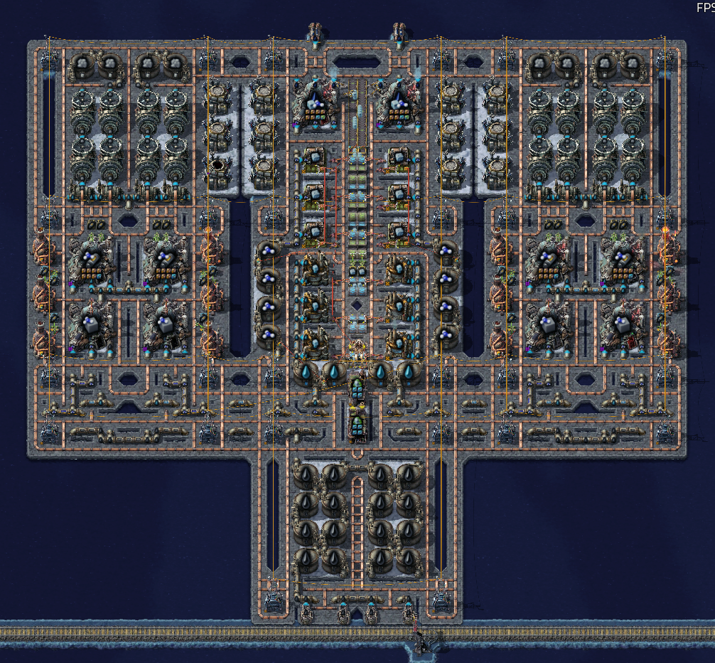 >>557325269It just depends on whether or not I set up a train network. If you set up a proper train network, you can pretty trivially just haul all the iron and coal you need to process sulfur and plastic at a refinery site, then haul the products to your main factory floor. If I don't set up a train network, I'll at least set up a double-headed train to haul the crude oil back to my base and handle it there. Either way, >2. Do you refine at the oil pumps and pull refined oil?Don't do this since it's bad for scaling. Just make a train or a really long pipe, and either haul that shit back to your base or a refinery site. The oil might be infinite, but if you scale up enough, you'll have supply issues if you're processing everything at your pumps (or at least have to do some really jank shit to make it work).