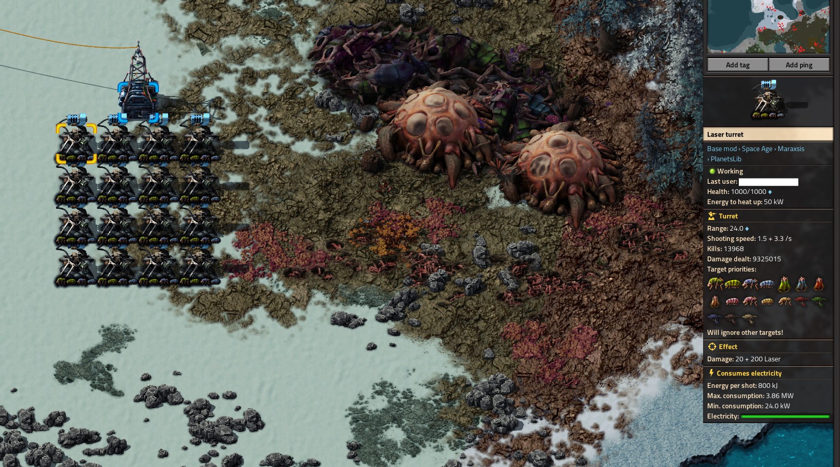 >>557758309yeah you need to use rockets, regular ones will do. they have crazy resistances to everything but explosivesthey have 2000 flat physical damage resist and 10% reduction after that. for gun turrets shooting basic mags with 10 physical damage increases (so +200%, or 15 damage per bullet), you'd do 0.00045 damage per shot to a big asteroid, requiring 4.5 million rounds to actually destroy one. assuming my math and numbers are correct, at least. i don't know if factorio has a minimum damage that your bullets would get rounded up towards. but either way, it's pretty grimmake sure you tell your gun turrets not to shoot them when you get rockets