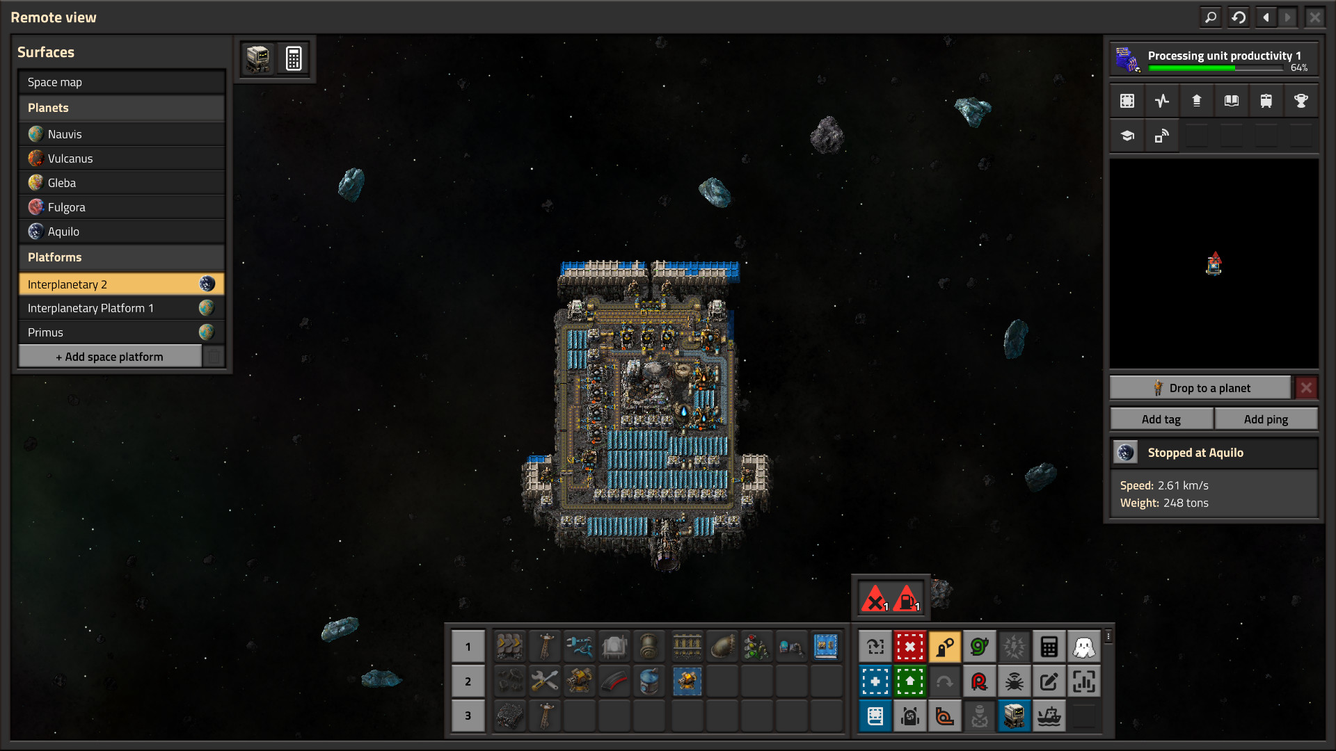 >finish researching aquilo>decide to just pop on by to see what it's like>spacecraft barely limps into port>touch down on the planet>no resources other than ice, lithium, and oil>platform won't survive the return trip for supplieswow I did not see this comingbig asteroids take piss damage from turrets, am I supposed to start shipping up the supplies for nukes? or will regular rockets workdidn't think I'd need to redesign the platform until after aquilo, but it looks like it'll definitely need a faster and stronger ship, especially considering how much it seems to rely on the extraplanetary resourcestime to reload a save and go back to the drawing board, I guess the requirement for advanced asteroid processing makes sense now