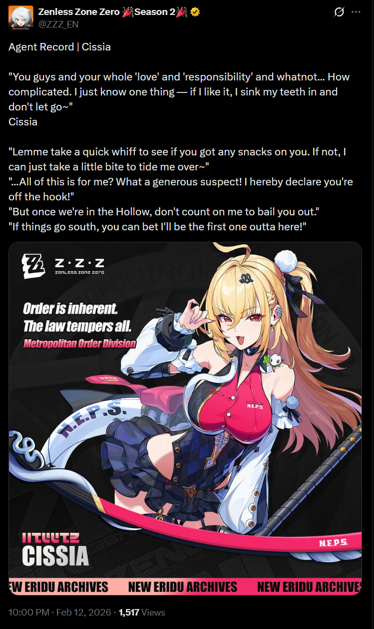 Previous: >>557168932>NewsVersion 2.6 "Encore for an Old Dream" Special Programhttps://youtu.be/oTRy9pZ4TYE [Embed]Agent Record | Ariahttps://www.hoyolab.com/article/43039871Agent Record | Sunnahttps://www.hoyolab.com/article/43037944>Newest Trailer/Teaser/Character demohttps://youtu.be/0DmndMnuh5E [Embed] (EN)https://youtu.be/TJXSiIESLyc [Embed] (JP)https://youtu.be/06G8YgOrXTw [Embed] (EN)https://youtu.be/FJ0HD6RC6PY [Embed] (JP)>Upcoming Events for 2.6https://zenless.hoyoverse.com/en-us/news/162561A Harmony of Delusions 02/05 - 03/23Angel's Invitation 02/05 - 04/15Delusion Special 02/05 - 03/23Potential Hypothesis: Frosted Feathers 02/05 - 03/23Livestream for Fluttering Wings 02/05 - 03/23Gilded Surprise, Wonderful Boo-ns 02/14 - 02/25Stacking Fortune 02/16 - 02/24Advanced Bounty: Area Patrol 02/25 - 03/02Gravitational Storytime 03/04 - 03/23"En-Nah" Cheersquad Gift 03/04 - 03/23Snap! Hollow Real Showdown 03/09 - 03/23High Score Card Collector 03/16 - 03/23>Redeemable codes (claimable in-game or online)https://zenless.hoyoverse.com/redemptionZENLESSGIFTZZZ25MINAZHAOISFREEShunguangWinterGiftZZZ20265OZ2HDP95IZZZANGELSZZZ26DELUSIONZZZSUNNAFL0PPEDAODDEBUTZZZAOD0206ZZZCREATOR26>Resources and useful linkshttps://rentry.org/zzzlinkshttps://rentry.org/ZZZ-Friendshttps://rentry.org/ZZZ-Guilds>/zzz/ OP pastebin (use this if making new thread):https://pastebin.com/PzbMf13P