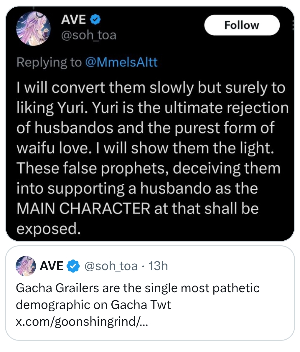 >>557217792To be a western gacha content creator is to be a drama slopper. The ones that aren’t offensively bad just play the games they want to for a reason.