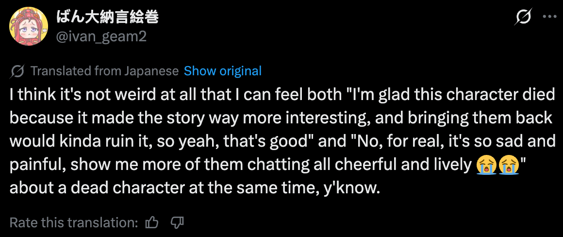 so if volume ex has a tone issue, or a theme issue, I'm going to want to bring it up and voice that rather than just say "yeah all good, there was nothing about that that rubbed me the wrong way". Ah well. I'll just be called a shitposter and then when global releases, after JP is long done with the story, people who also think that the development was mishandled will just be told "yeah but everything turned out well in the epilogue!"