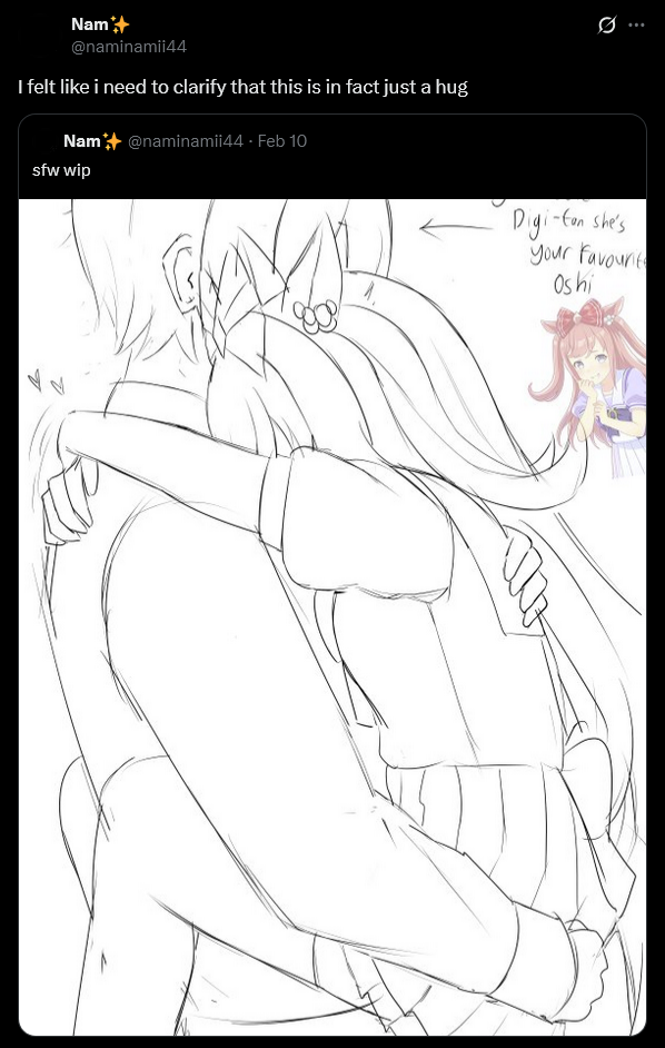 >>557208405I imagine it's just AIslop, generic pinups, yurisecondary shit, and occasionally one in-character art but made by somebody who'll wipe their socials if their miso soup isn't the right temperature. You have my pity.
