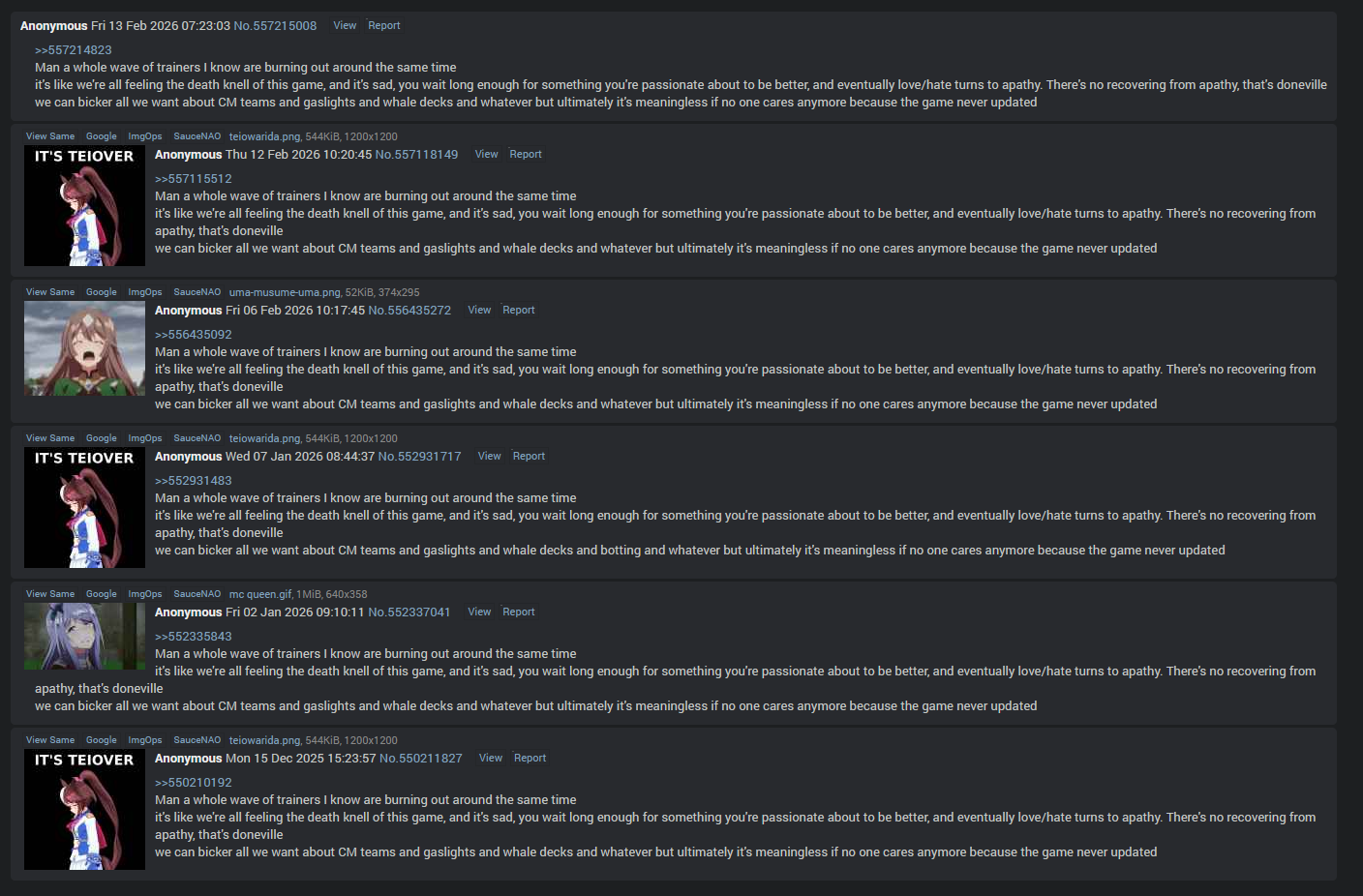 There's no way 15+ different anons come out of lurking on a dead thread to reply to an ethnicity-uma bait post when there's at most 7 of us here at the same timeIt has to be one guy replying 9 different times out of boredom