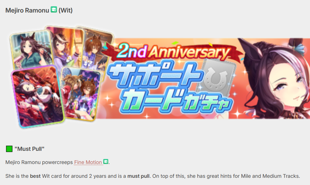 Previous: >>557169002>Global Game NewsLink your account to Cygames iDCurrent Scenario: Aoharu Hai aka "Unity Cup"Current Rate Up Trainee: New Year's Scout (3*)Current Rate Up Support Cards: New Year's Scout (SSR), SSR Sasami Anshinzawa (Pal), SR Tamamo Cross (Guts)Current CM: Capricorn Cup - Chukyo Turf 1200mMain Story Chapter 5 is out01/27 - New Beginnings Part 101/29 - NY Opera & Haru 3*+Fuku SSR+Ayabe SSR02/05 - 02/12 Racing CarnivalMid February - Capricorn Cup - Chukyo Turf 1200mhttps://umamusume.com/news/100040/https://pages.snep.pw/uma/anni-skill-changes/>JP Game NewsCurrent Rate Up: Valentine Taiki Shuttle (3*), Valentine Sounds of Earth (3*), SSR Matikanefukukitaru, SSR Neo UniverseNew Scenario "Yukoma Hot Spring" releasedTimeline: https://uma.moe/timelineCygames Webstore: https://webstore.cygames.com/en/umamusume_en/>Thread Clubshttps://rentry.co/umaglobalclublistYou must be E3 (20k points) to join a circle. Apply with /uma/ or /vg/ in your profile or post ID in the thread.>All Guides & Resourceshttps://rentry.org/uma26Game databaseuma.guideComprehensive guide, still in progresshttps://gametora.com/umamusume (Click the gear to switch between JP / global server info)A basic guide for newfagshttps://rentry.org/umaglobalFind networks if your region is blocked from the game or clienthttps://www.umavpn.top/93Seiyuu & Concertshttps://rentry.org/umstUma Texthttps://umareader.idsmile.xyz/