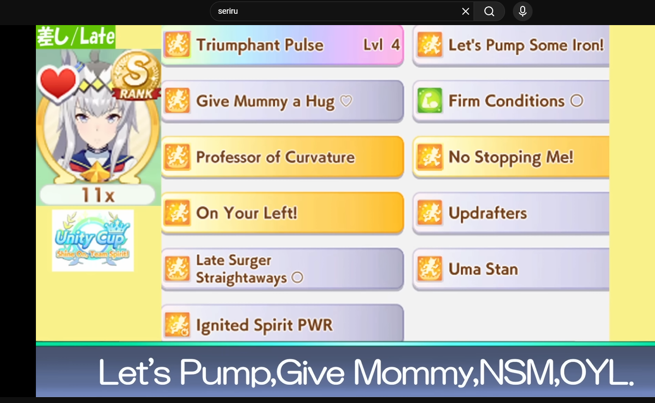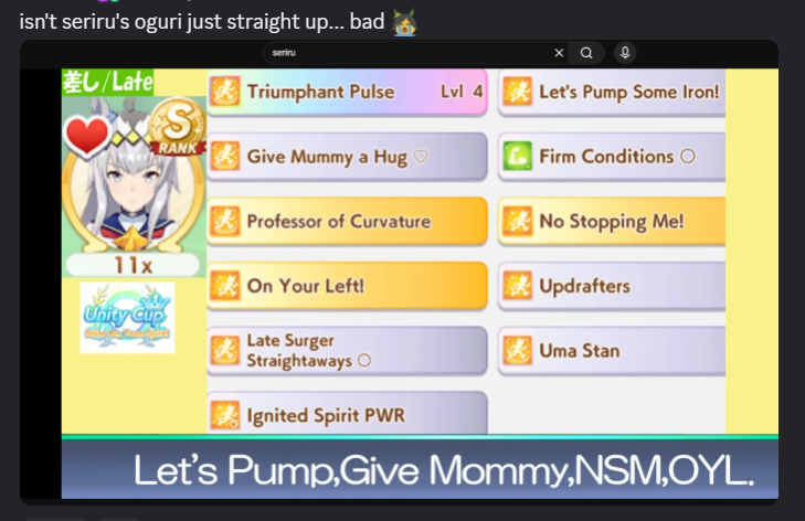 >Chiyo-chan hits Turbo Sprint, Head On, Speed Star, Mummy and Plancha to overtake Curren Chang>my late Oguri hits everything in her arsenal (OYL, Red Shift, Divine Might and Pulae) to cuck Chiyo from victory by a nose