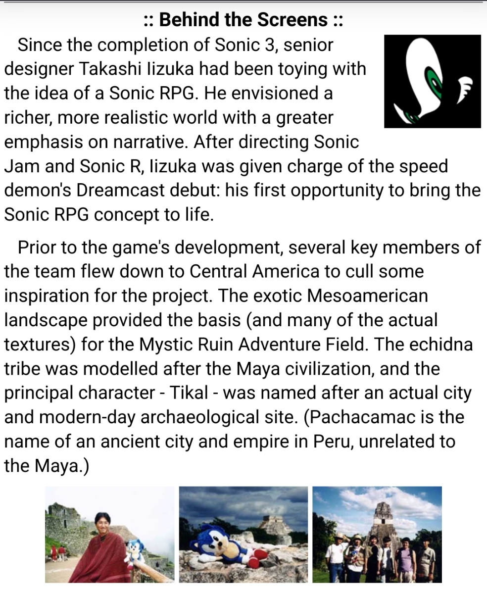 >>557228627>the number of POVs isn't necessarily story intent, you're assuming that on the part of the writer'sI don't know what this is trying to argue. It is pretty common sense that if two stories show the same event, the overlap is the truth about what happened>Gamma's own memories for example are only shown in his route — and contradict every other route — but they're the most reliable of what actually happened to him since they're coming straight from him.If a character has something happen in their route that no one else was around to see or contradict, then it can be believed at face value—Gamma's origin, Knuckles being fooled by Eggman, Amy standing up to Zero, Tails saving Station Square from Eggman. So I don't know why this is part of your argument.
