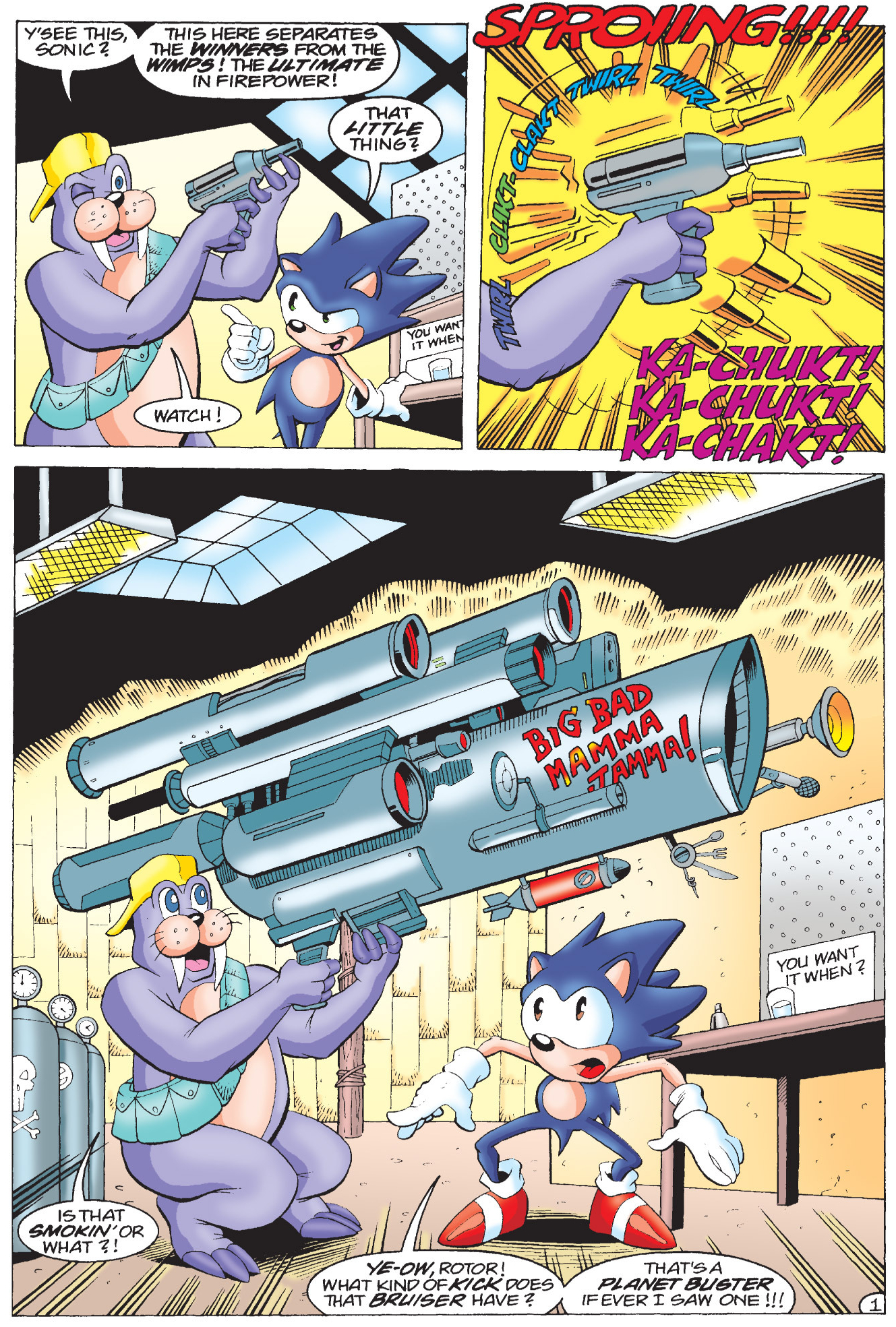 Satam rotor feats:Built a malfunctioning robotBuilt a malfunctioning hair clipperHacked into Robotnik's computer Built an electromagnetSatam Sally feats:Built a universal translatorReverse engineered the roboticizer into a derobiticizerRebuilt a laser tank Hacked into Robotnik's computer I think the solution is to make Rotor a weapons guy.