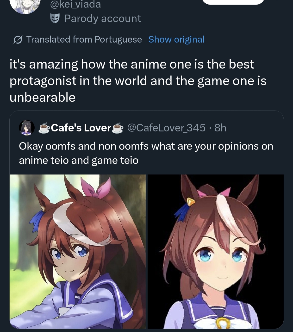 People finally noticed the difference between anime Teio and game Teio.Imagine being one of those people who tried the game due to how cool-yet-funny Teio in S2, only to see her get turned into bratty lolibait... it's amazing nips didn't sue cygames for false advertising back then.